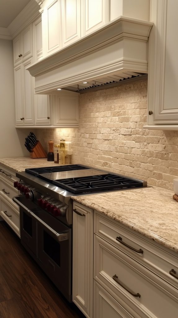 This kitchen exudes timeless charm with a beige brick-look backsplash that seamlessly complements the traditional cabinetry. The textured backsplash adds depth and character, creating a warm and inviting atmosphere perfect for cooking and gatherings. The soft, creamy tones of the backsplash beautifully harmonize with the granite countertops and dark wood flooring, establishing a balanced and cohesive design. This look is ideal for those seeking a classic kitchen style with a hint of rustic elegance, offering both visual appeal and practical durability.