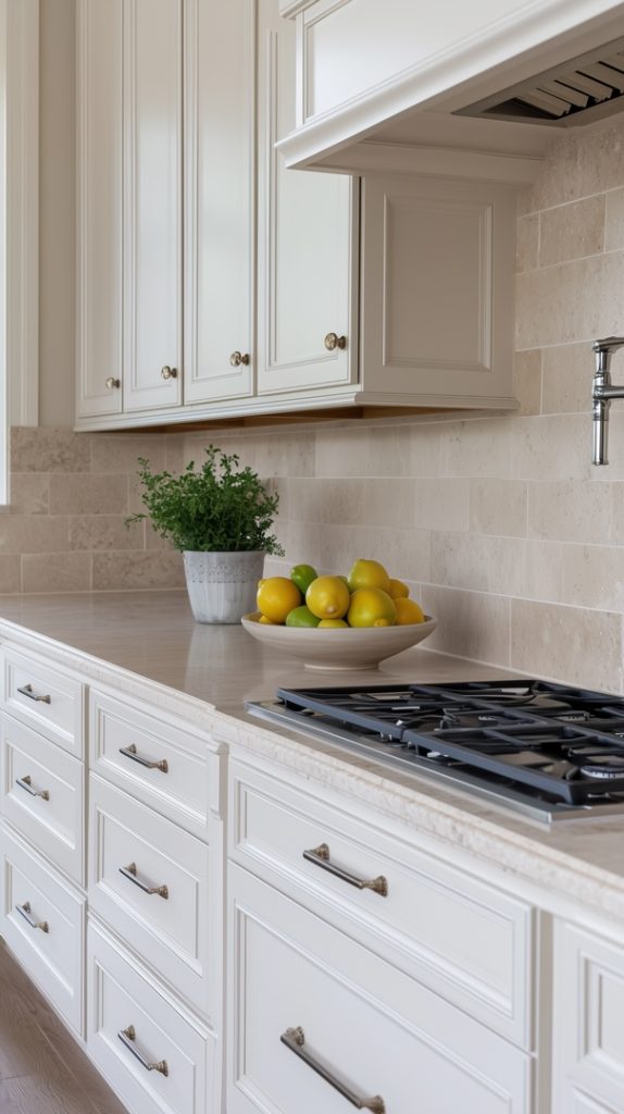 The soft beige tones in this backsplash create a harmonious look with the surrounding cabinetry and fixtures. The tiles’ subtle variation in shade adds depth without overwhelming the kitchen’s clean design. This style is ideal for creating a cozy, welcoming atmosphere in the kitchen while maintaining a polished and elegant appearance.