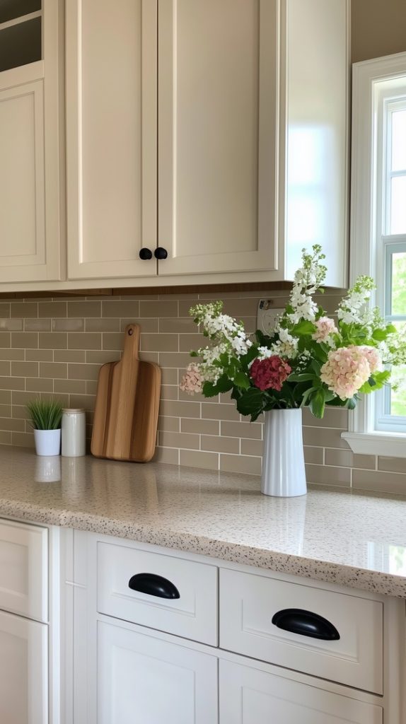 Incorporating an earthy feel, this beige-toned backsplash provides a rustic yet elegant ambiance. The warm color palette complements the dark wood cabinetry, while the tile’s matte finish adds texture and depth. Greenery accents enhance the natural vibe, making it a cozy and inviting space perfect for a modern farmhouse look or a nature-inspired design.