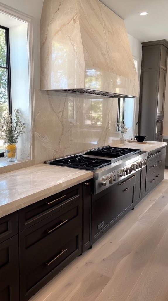 A classic take on the beige theme, this kitchen focuses on a sophisticated stone backsplash with a seamless transition between the countertop and the backsplash. The backsplash tiles mirror the earthy beige hues found in the cabinetry, creating a natural, grounded look. Wooden cabinetry, paired with the backsplash’s stone texture, adds an element of timeless charm. This design beautifully balances luxury and rustic warmth, making it an inviting space for cooking and entertaining.