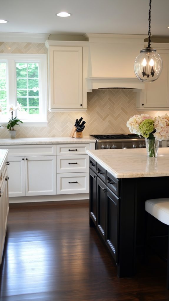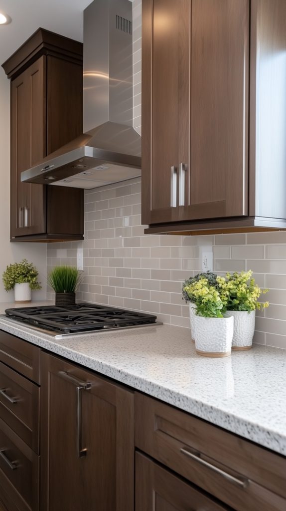 This kitchen pairs a classic beige backsplash with dark wood accents, creating a striking contrast. The backsplash tiles, arranged in a simple yet elegant pattern, serve as a neutral canvas that enhances the cabinetry’s darker tones. The result is a sophisticated and inviting space that feels timeless and refined, perfect for homeowners who want a kitchen that exudes elegance and comfort.