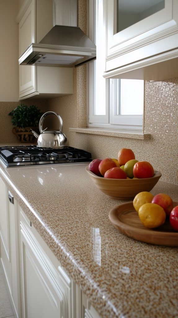 In this design, the minimalist beige backsplash offers a clean backdrop that emphasizes the kitchen’s sleek granite countertops. The large tiles enhance the spacious feel, while their polished surface creates a harmonious reflection. This combination of beige and granite is perfect for those who appreciate modern simplicity with a touch of sophistication.