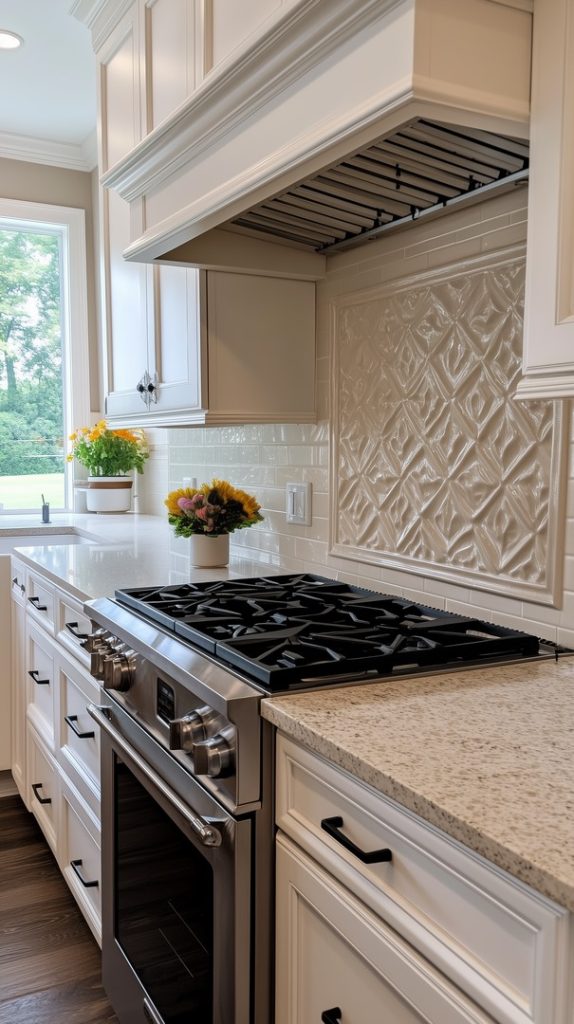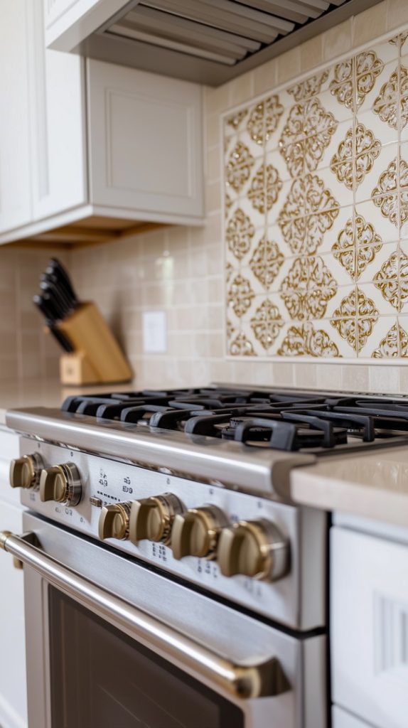 For an artistic touch, this backsplash features intricate beige patterns that add character and personality to the kitchen. The delicate motifs break the monotony of solid colors, turning the backsplash into a focal point. This design works beautifully with both modern and traditional kitchens, offering a hint of vintage charm.