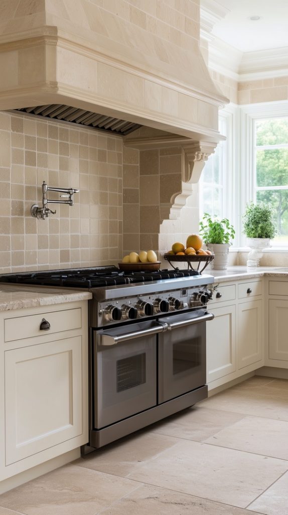 This design showcases a beige backsplash with a rich, ornate pattern, adding an element of intricate detailing to the kitchen. The backsplash covers the entire area above the stove, making it the focal point of the space. Beige tones in the cabinetry and walls maintain the neutral palette, allowing the intricate details to shine. This kitchen captures a sense of old-world luxury blended with contemporary convenience.