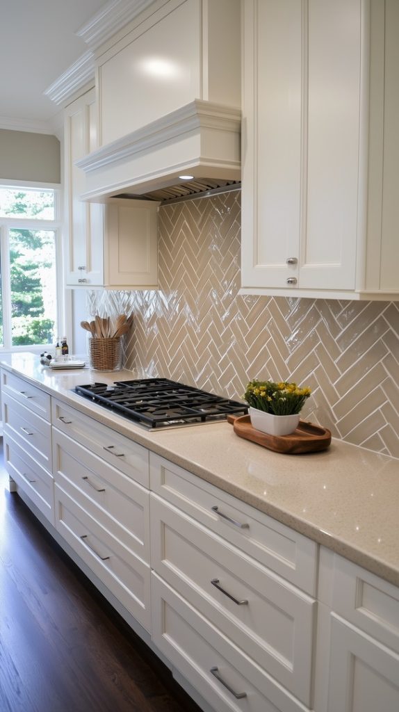 With a focus on elegance, this kitchen features a beige herringbone backsplash that acts as the perfect backdrop for the sleek white cabinetry. The glossy finish of the tiles adds a touch of luxury, while the herringbone pattern brings a refined edge. The combination of the light beige tiles and white cabinetry keeps the space bright and welcoming, making it ideal for small to medium-sized kitchens.