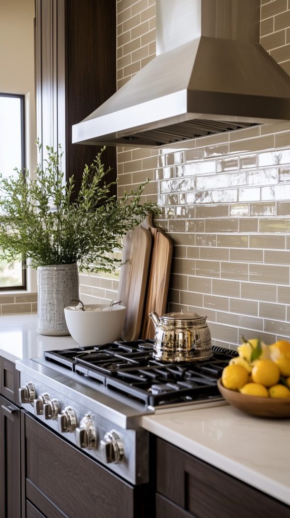 This kitchen makes a statement with a high-gloss beige backsplash that plays with light to create a bright and open environment. The reflective quality of the tiles adds a touch of glamour, while the neutral tones keep the overall design grounded and warm. Paired with dark wood cabinetry, it creates a striking yet inviting contrast perfect for a contemporary kitchen.