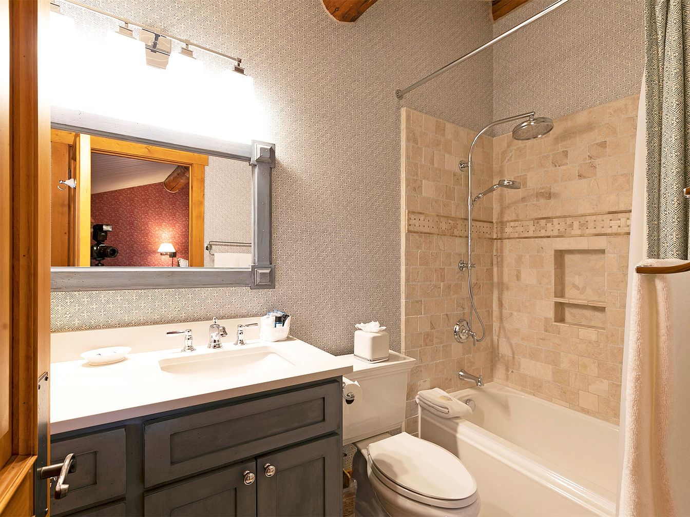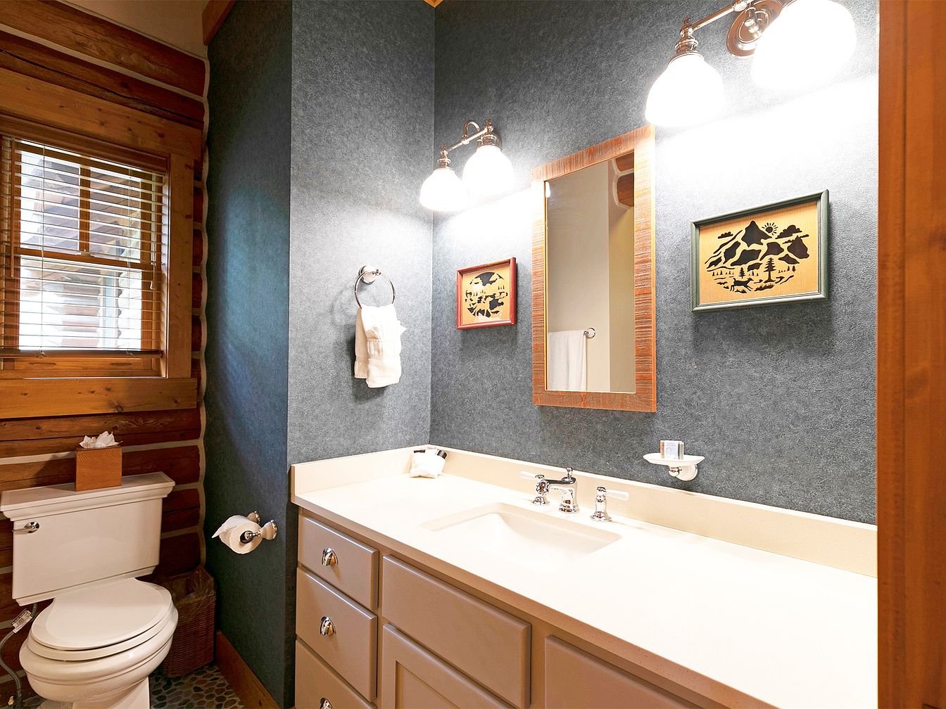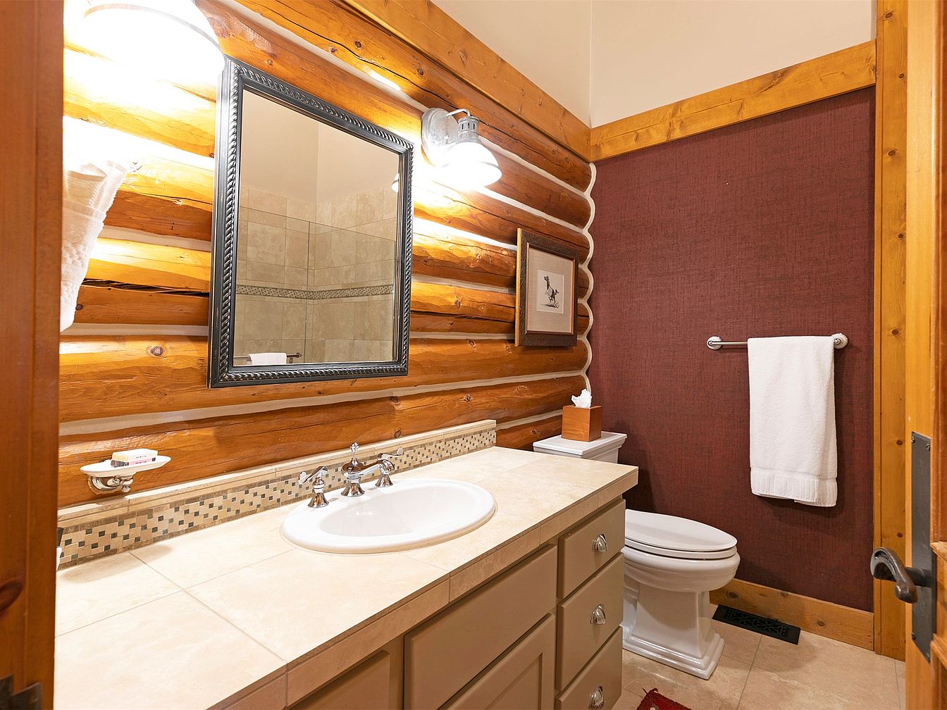 This inviting bathroom features a charming log cabin design, showcasing natural wood paneling that creates a warm and cozy atmosphere. The spacious vanity area boasts a large, oval sink set in smooth stone, complemented by tasteful chrome fixtures. Above the sink, a beautifully framed mirror reflects light from dual wall sconces, enhancing the bright ambiance. The walls feature a rich burgundy accent that adds depth, while the subtle tile patterns on the countertop bring texture. Essential family-friendly amenities include ample storage beneath the sink and a plush towel rack, ensuring both practicality and comfort.