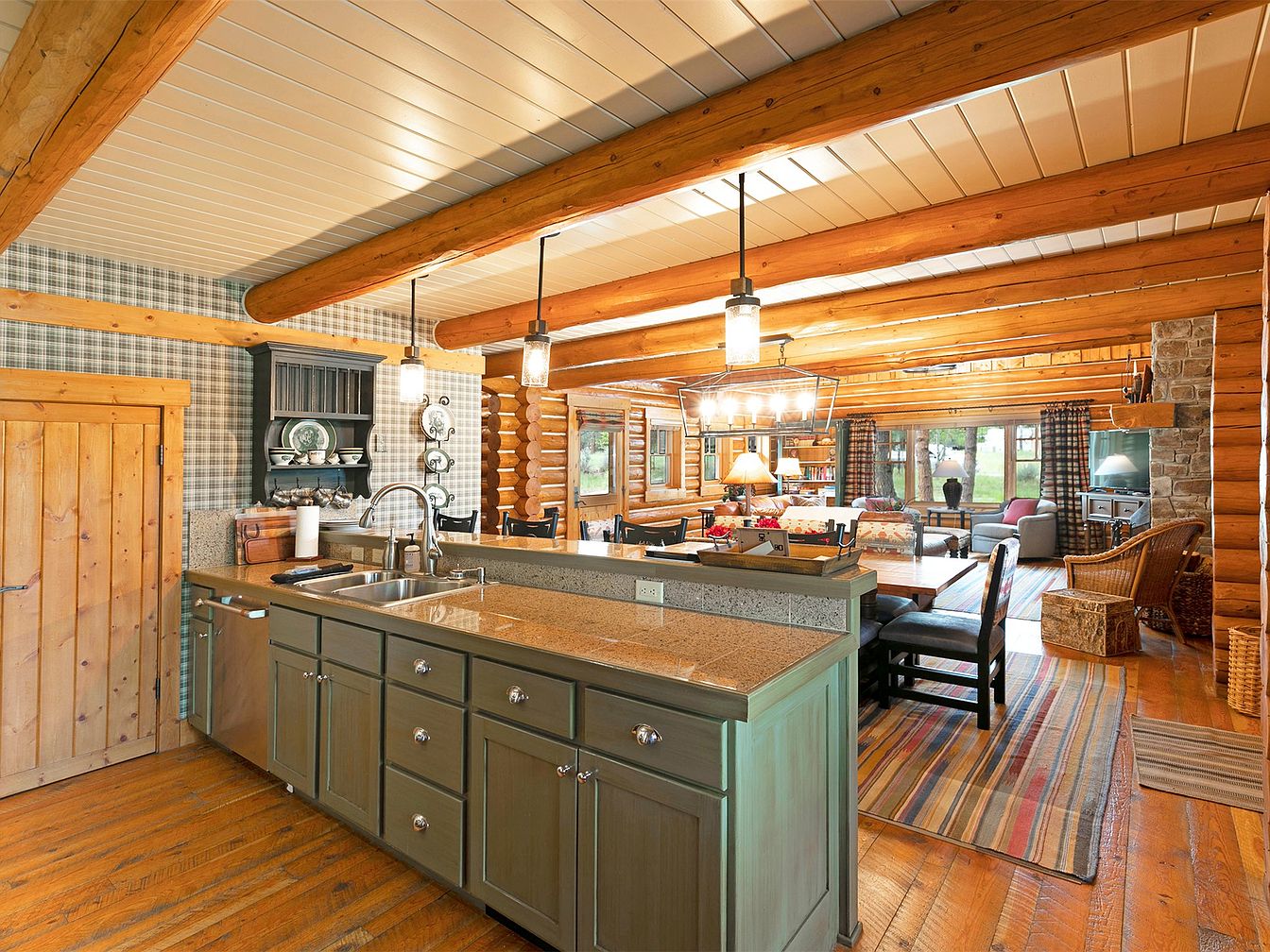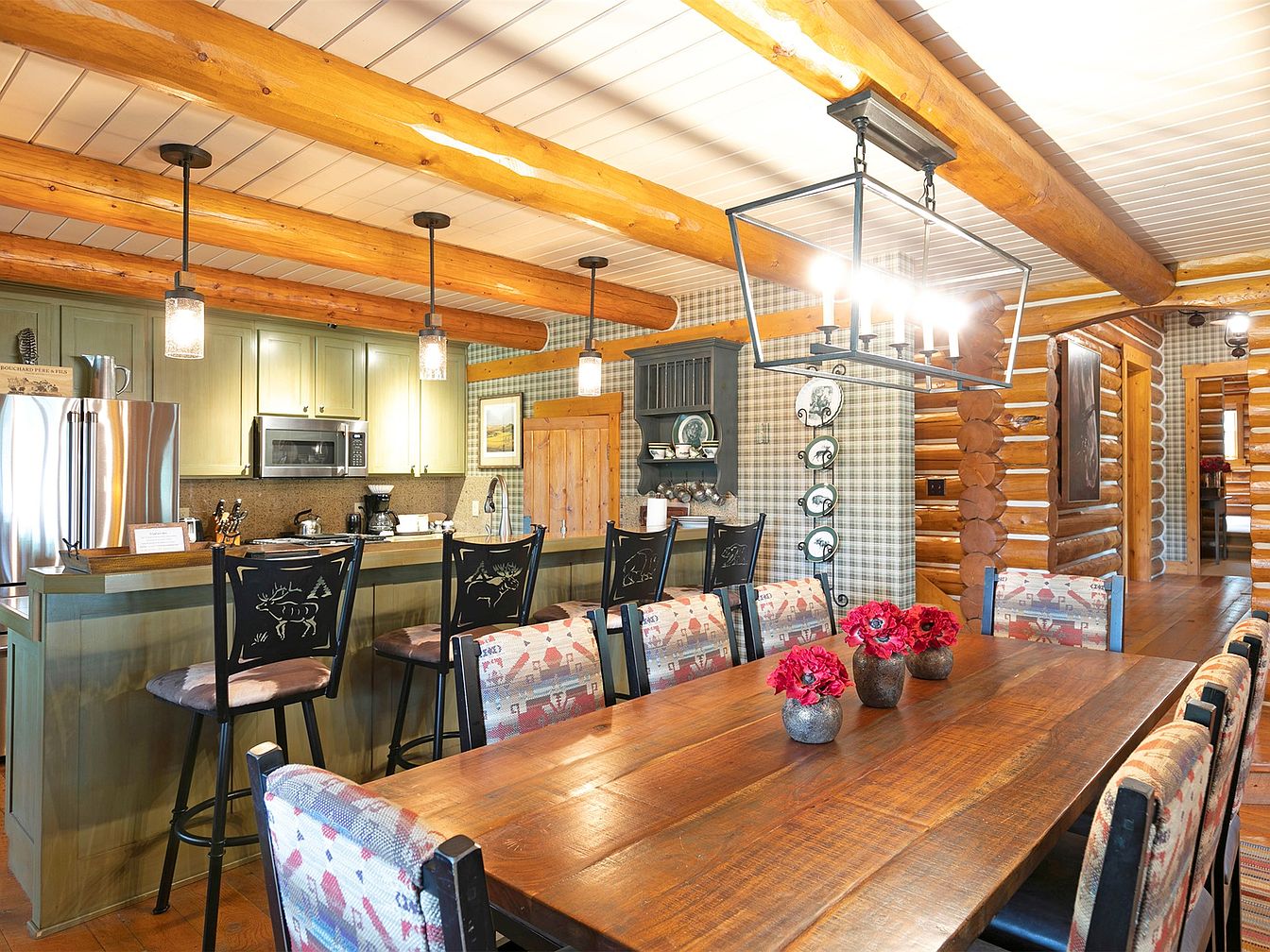This inviting kitchen and dining area features warm, rustic charm with exposed wooden beams and natural log walls. The spacious layout includes a dark green kitchen island with modern fixtures, complemented by a beige countertop. Checkered wallpaper adds a touch of homely comfort, while a stylish backing shelf displays beautiful dishware. Bright pendant lights illuminate the space, enhancing the cozy ambiance. The adjacent dining table accommodates family gatherings, surrounded by charming hardwood chairs. Large windows offer scenic views, filling the area with natural light, making it a perfect family-friendly space for cooking and dining together.