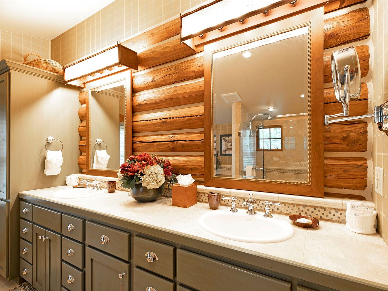 This inviting bathroom showcases a combination of rustic charm and modern convenience. A dual-sink vanity with dark cabinetry is paired with a light stone countertop, offering ample space for family use. Above, framed mirrors reflect warm lighting, enhancing the cozy atmosphere created by the log wall accents. Thoughtful design includes attractive floral arrangements and neatly placed towels, ensuring practicality while adding aesthetic appeal. The soft color scheme combines earth tones with cream tiles, contributing to a tranquil environment. A glass shower enclosure neatly separates the bathing area, emphasizing the room’s contemporary features while maintaining a welcoming family-friendly vibe.