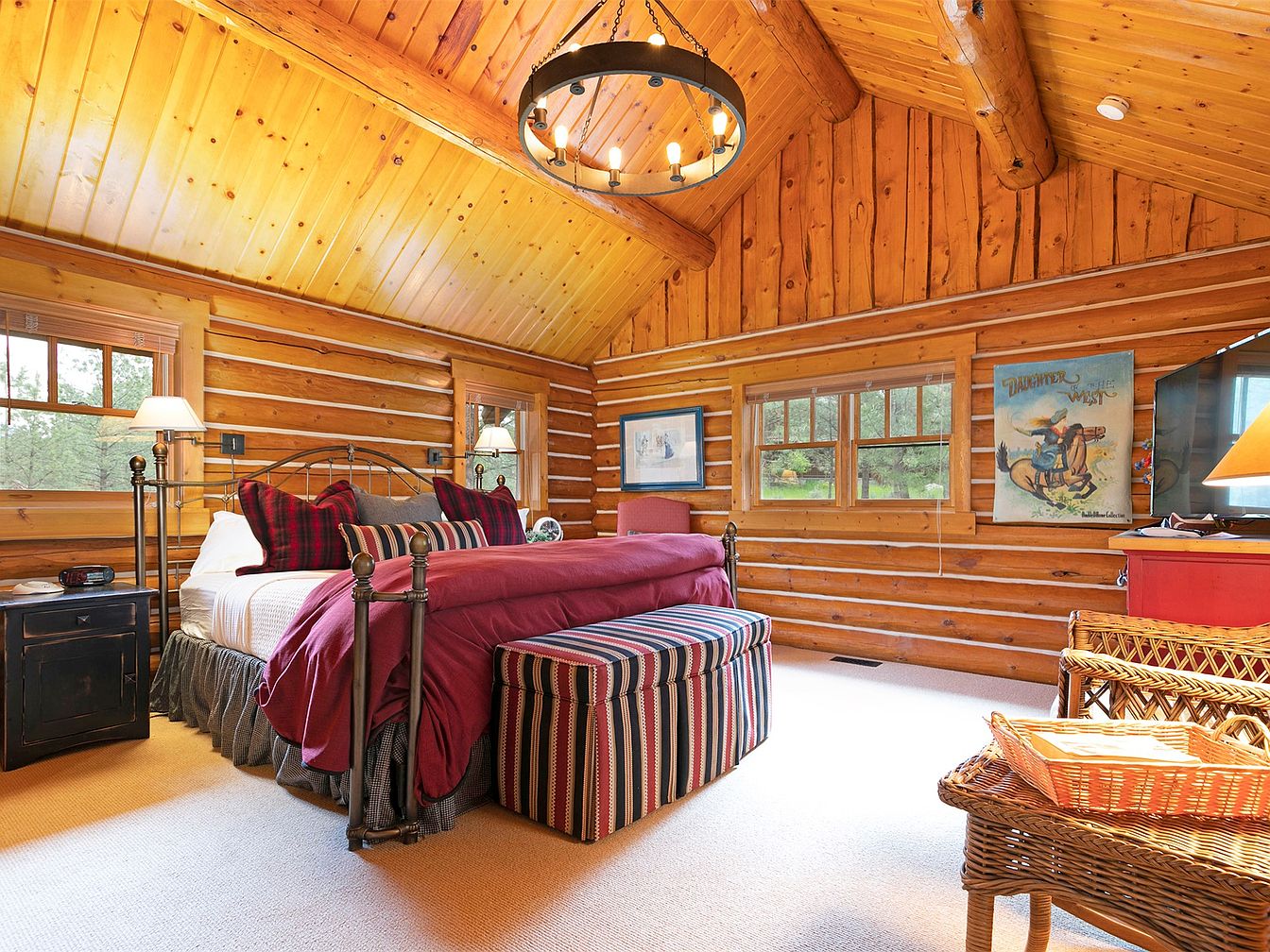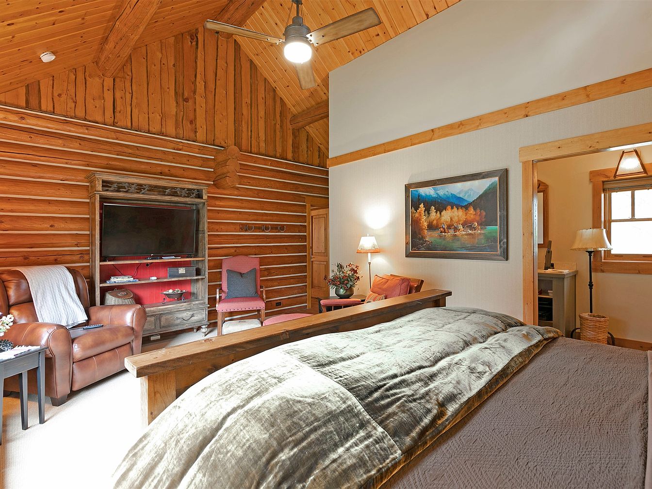 This inviting bedroom features a warm, rustic aesthetic with exposed wooden beams and log walls, creating a cabin-like atmosphere. The layout includes a plush, king-sized bed with a soft, textured duvet, providing comfort and relaxation. An elegant brown leather recliner sits adjacent, perfect for reading or unwinding. A stylish wooden entertainment unit houses a television, while decorative artwork of a serene landscape adds character. Soft lighting from bedside lamps enhances the cozy feel, and the thoughtful arrangement allows for an airy, spacious ambiance. This space is ideal for family living, combining style with functionality.