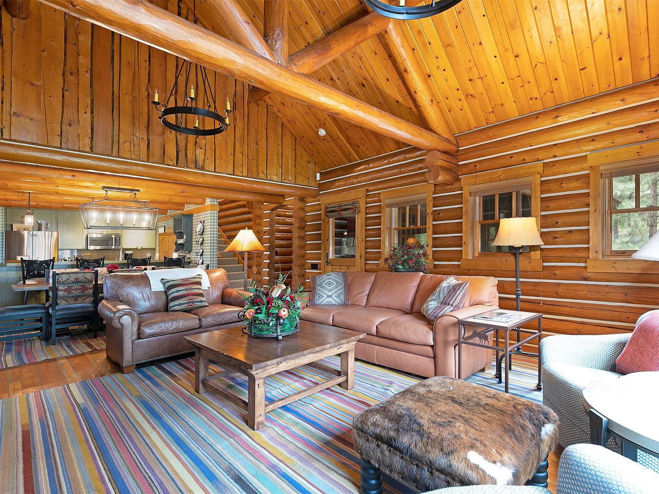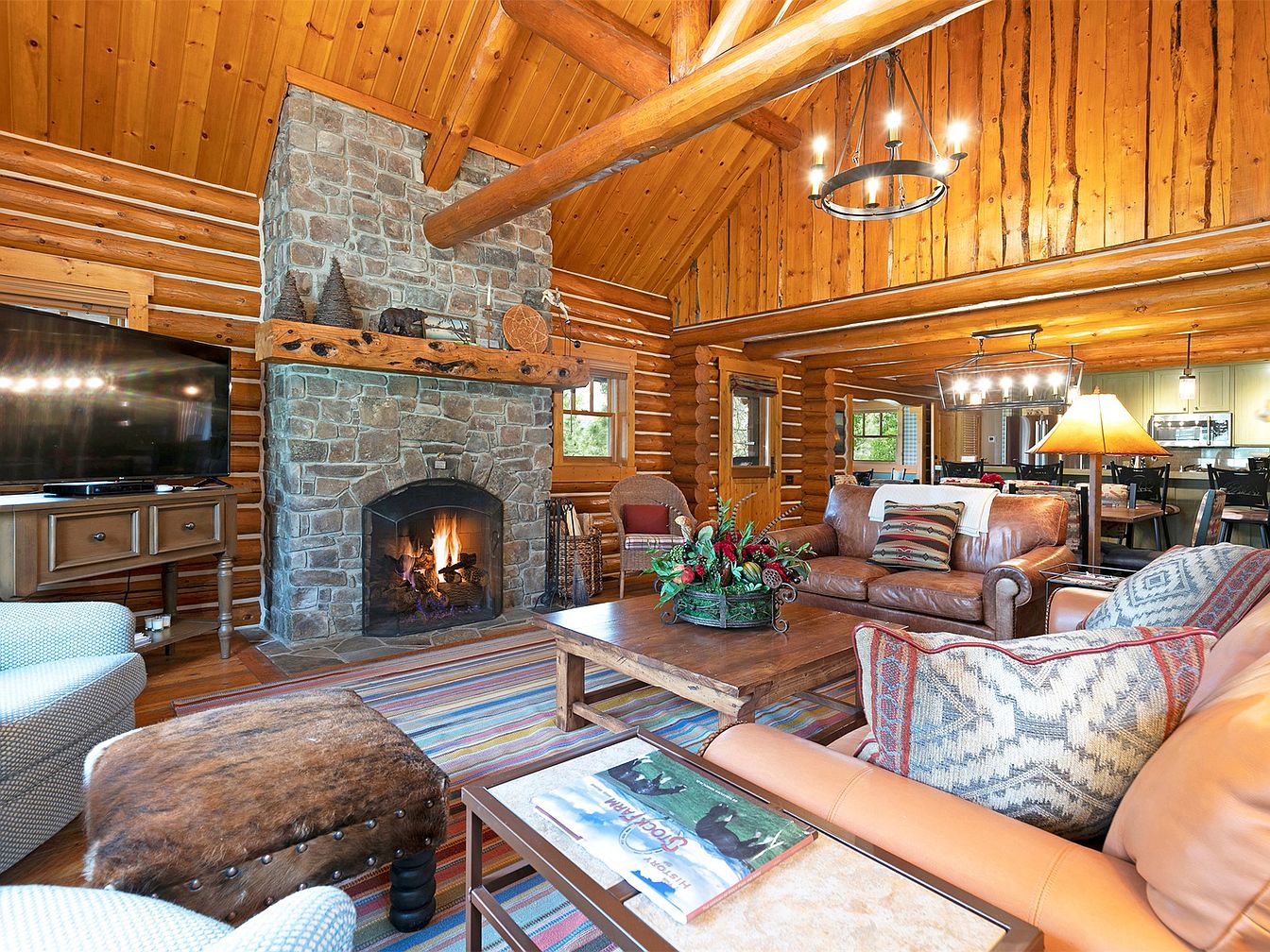 This inviting living room features a cozy stone fireplace, offering warmth and a focal point for family gatherings. The striking contrast of the log walls and ceiling creates a rustic charm, complemented by rich wooden beams above. Comfortable leather sofas are adorned with colorful patterned cushions, enhancing the space’s family-friendly appeal. A large wooden coffee table sits atop a vibrant striped rug, providing a perfect spot for games and relaxation. Natural light pours in through adjacent windows, ensuring a bright atmosphere. The stylish chandelier adds an elegant touch, harmonizing with modern amenities visible in the background.