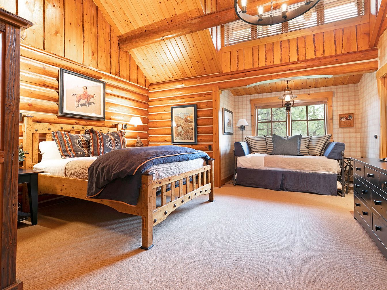 This inviting bedroom features stunning log walls that create a warm, rustic atmosphere. The centerpiece is a handcrafted wooden bed, adorned with colorful, patterned pillows and a plush navy blanket, perfect for restful nights. A stylish daybed, with striped cushions, offers additional sleeping space, ideal for families. Warm wood tones and natural textures harmoniously blend with the soft beige carpet, ensuring comfort underfoot. Large windows bathe the room in natural light, complemented by a classic chandelier and sconces, enhancing the cozy ambiance. Thoughtful decor, including framed artwork and small plants, brings a personal touch to this charming family retreat.