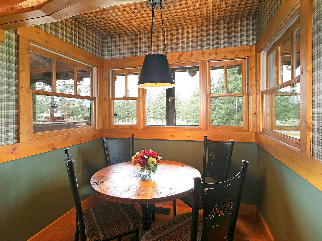This cozy dining nook features warm wood tones, highlighted by a beautifully crafted wooden table and black chairs with intricate designs. The layout embraces an intimate corner space, surrounded by inviting double-hung windows that allow natural light to flood in, offering picturesque views of the outdoors. The plaid wallpaper and green lower walls create a harmonious color scheme, combining rustic charm with a contemporary feel. The pendant light above provides a welcoming glow, enhancing the family-friendly atmosphere. This inviting space is perfect for casual family meals or enjoying morning coffee, making it a delightful place for gatherings.