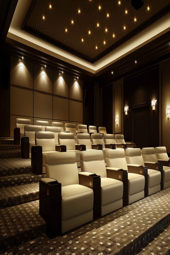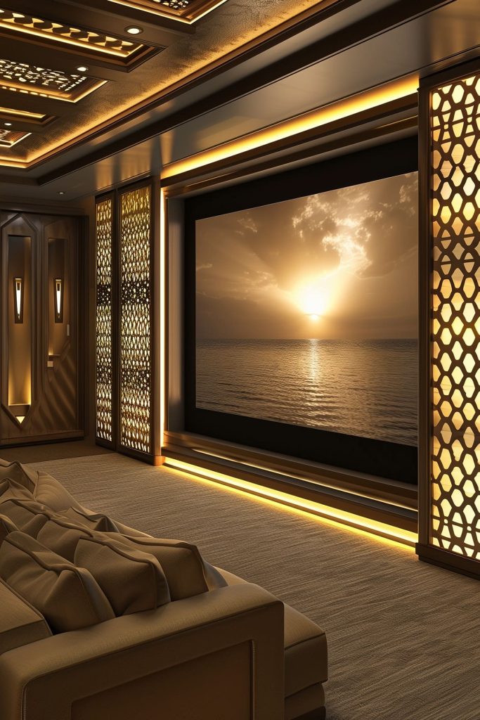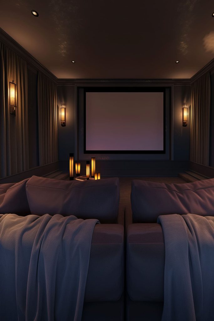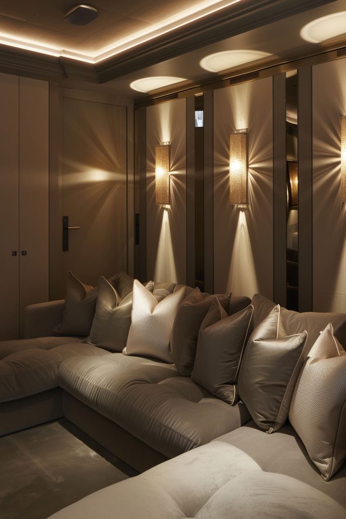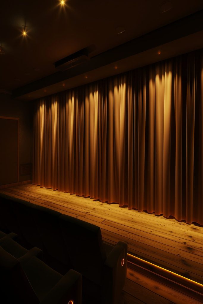 Install recessed floor lights along the baseboards to guide guests safely to their seats without disrupting the cinematic experience.