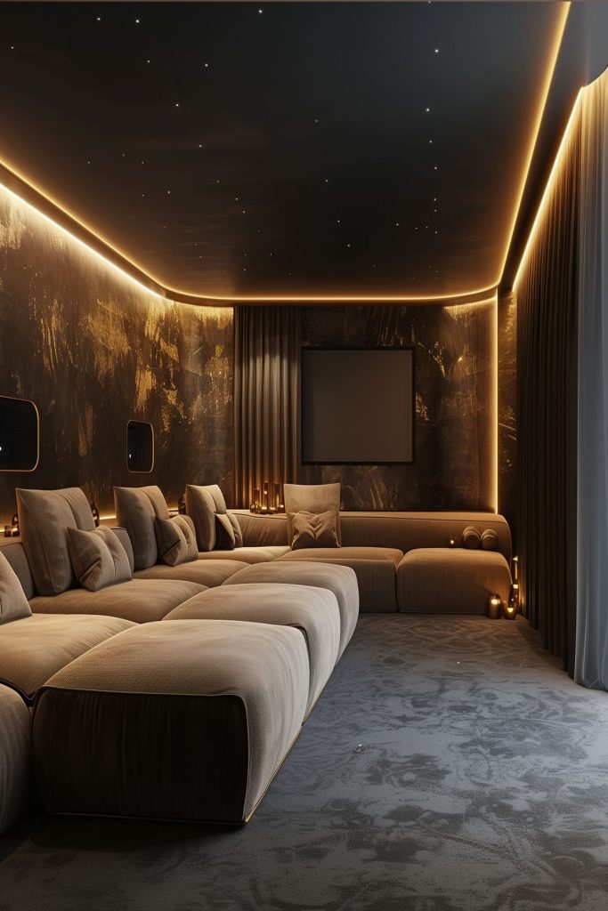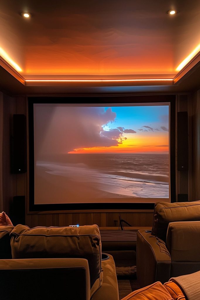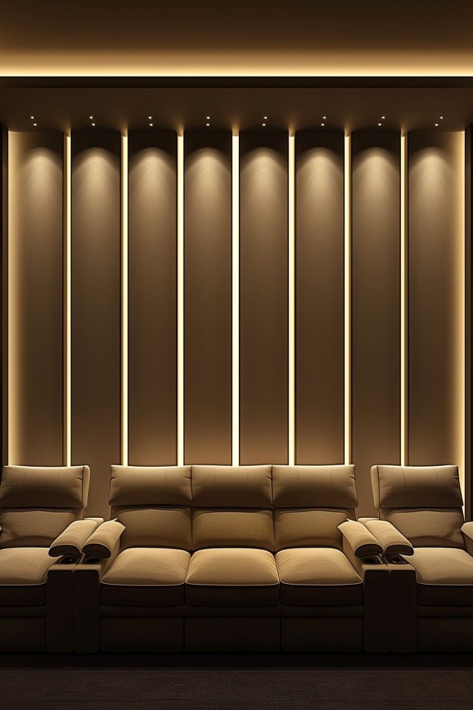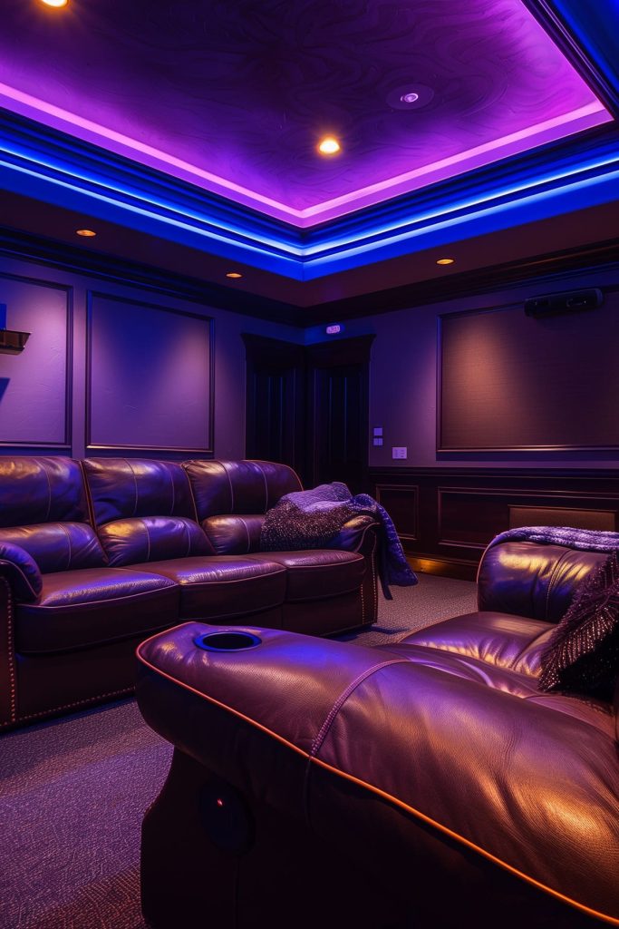 Illuminate the perimeter of the room with LED cove lighting to create a soft, diffused glow that enhances the theater’s ambiance.