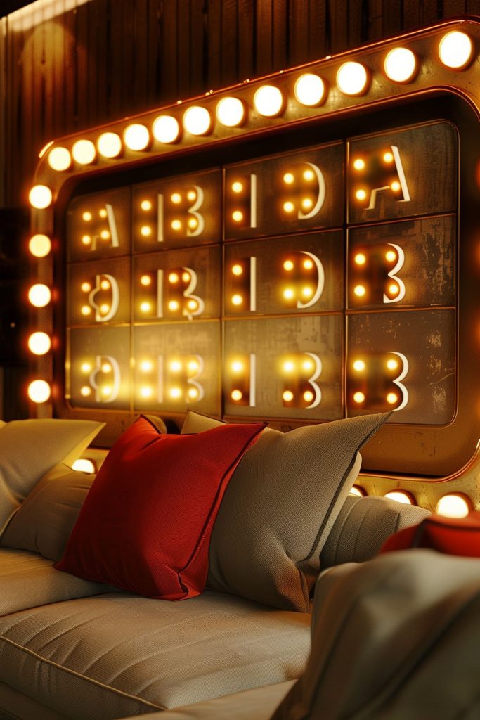 Create a retro cinema vibe with vintage marquee lights spelling out classic movie phrases or your family name.