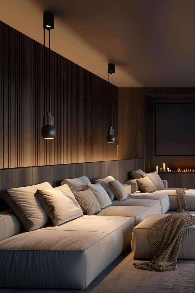 Hang adjustable pendant lights above the seating area to provide focused task lighting for reading or playing games between screenings.