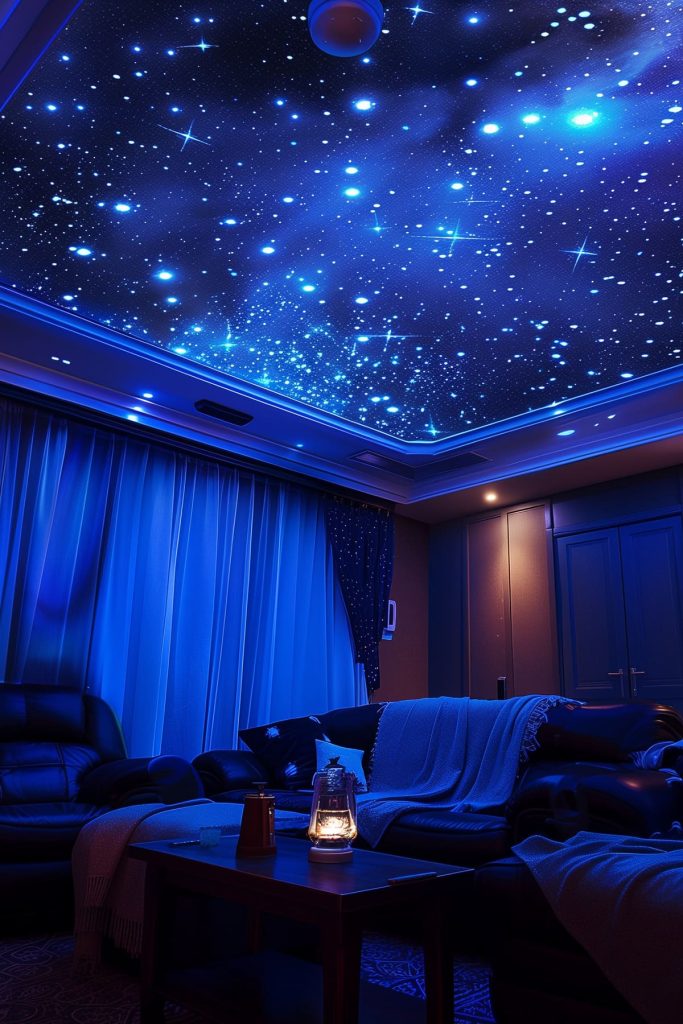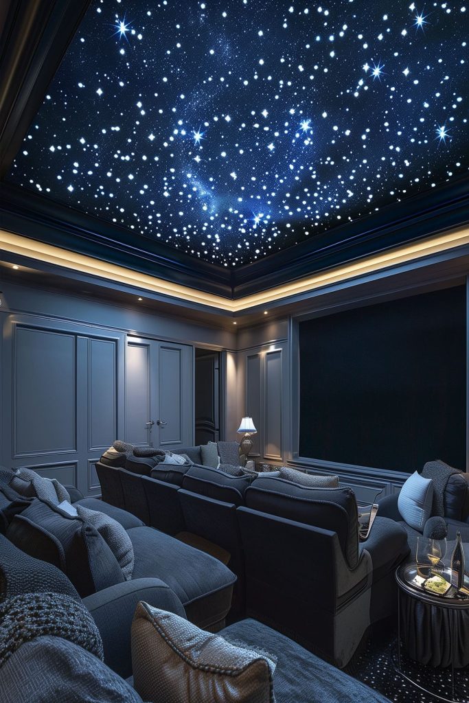 Create a starry night sky effect with a fiber optic star ceiling, mimicking the ambiance of a real theater.