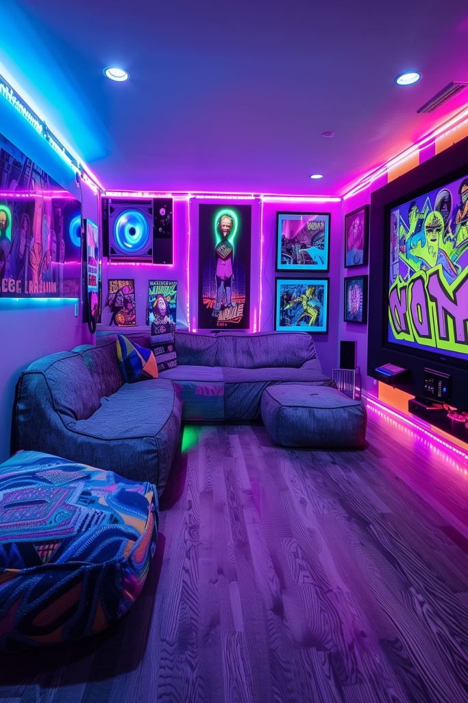 Create a neon glow effect with UV black lights, perfect for themed movie nights or glow-in-the-dark parties.