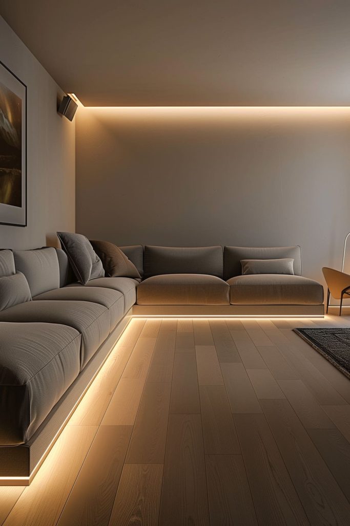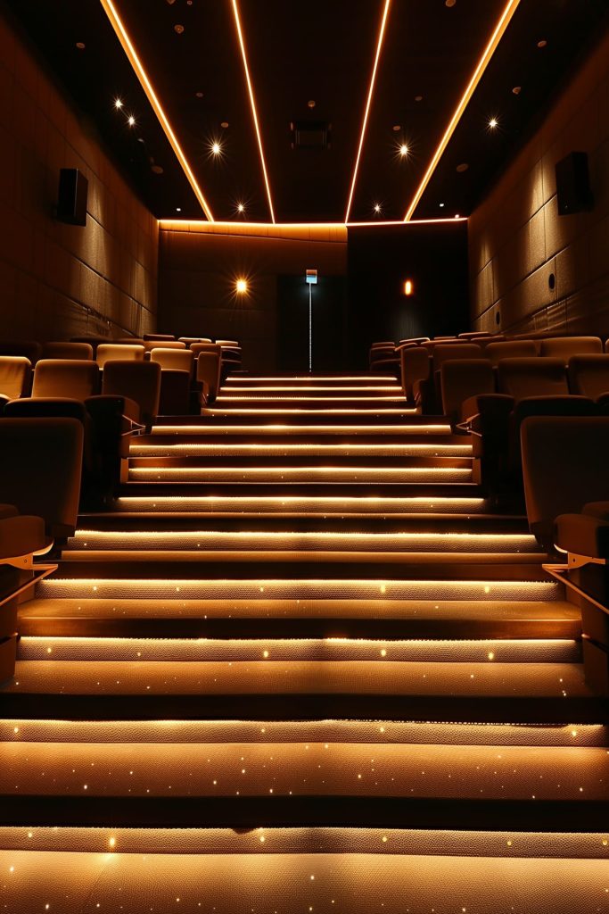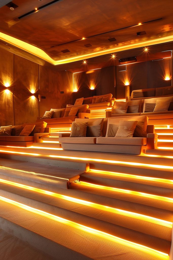 Illuminate the underside of seating platforms with tape lights to provide a soft glow and enhance the theater’s modern aesthetic.