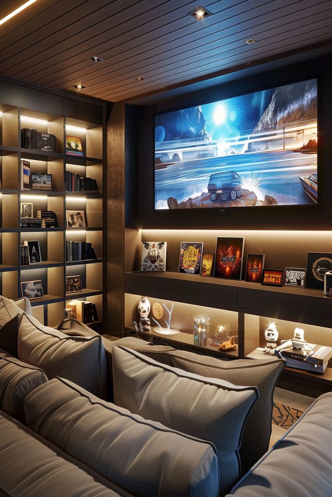 Install integrated LED recessed shelves to showcase movie memorabilia or collectibles while providing functional accent lighting.