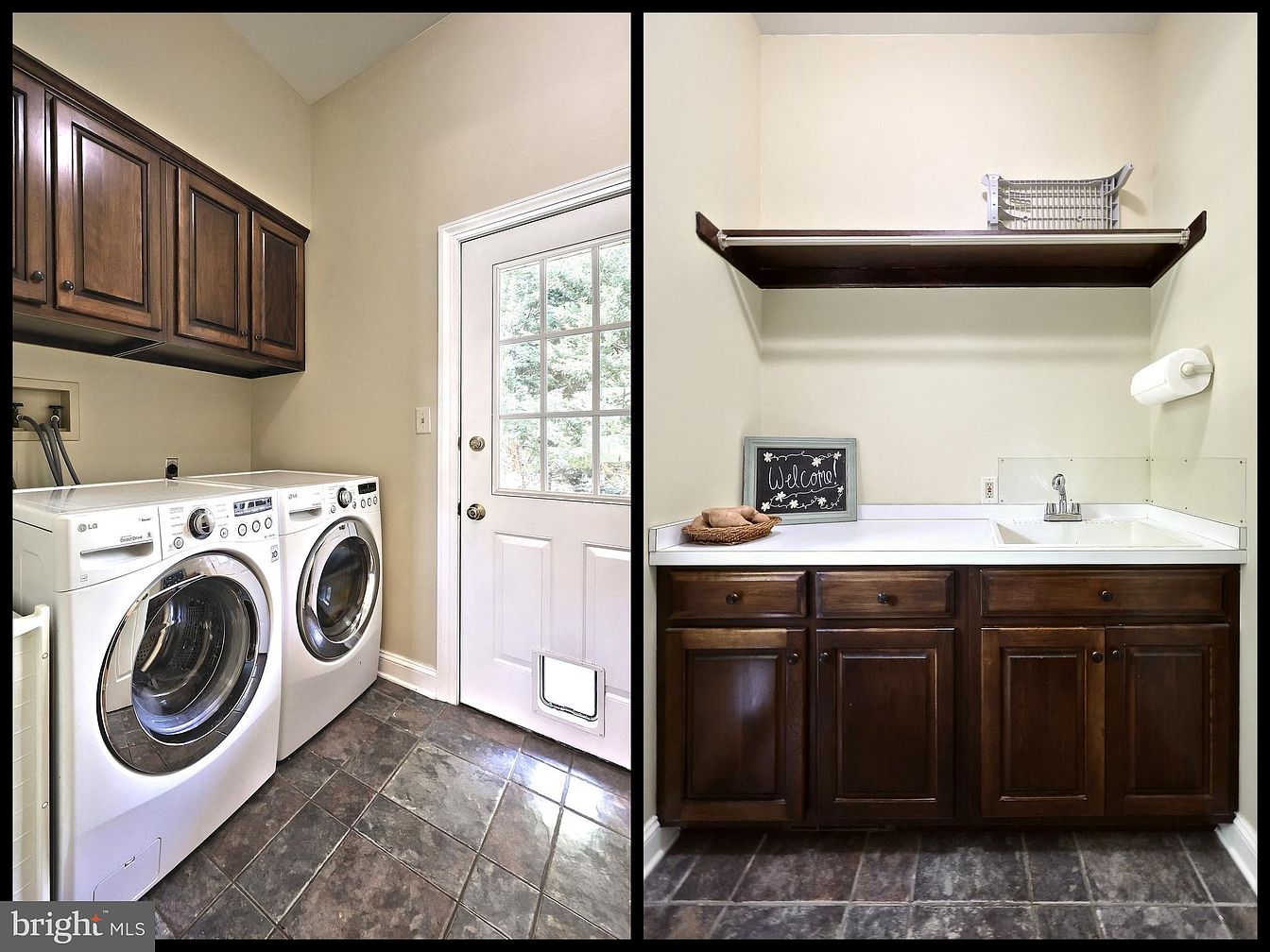 This laundry room features a practical and organized layout with a modern touch. The floor is covered in dark, textured tile that adds durability and contrasts nicely with the light beige walls. A set of front-loading white washer and dryer sit side by side beneath a row of rich, dark wood cabinets offering ample overhead storage. Opposite the machines, a wide countertop with a built-in sink rests above matching cabinetry, providing convenient workspace for laundry tasks. A floating dark wood shelf with a small basket and a welcoming chalkboard sign adds charm. The door with window panes allows natural light, contributing to the room’s airy feel.