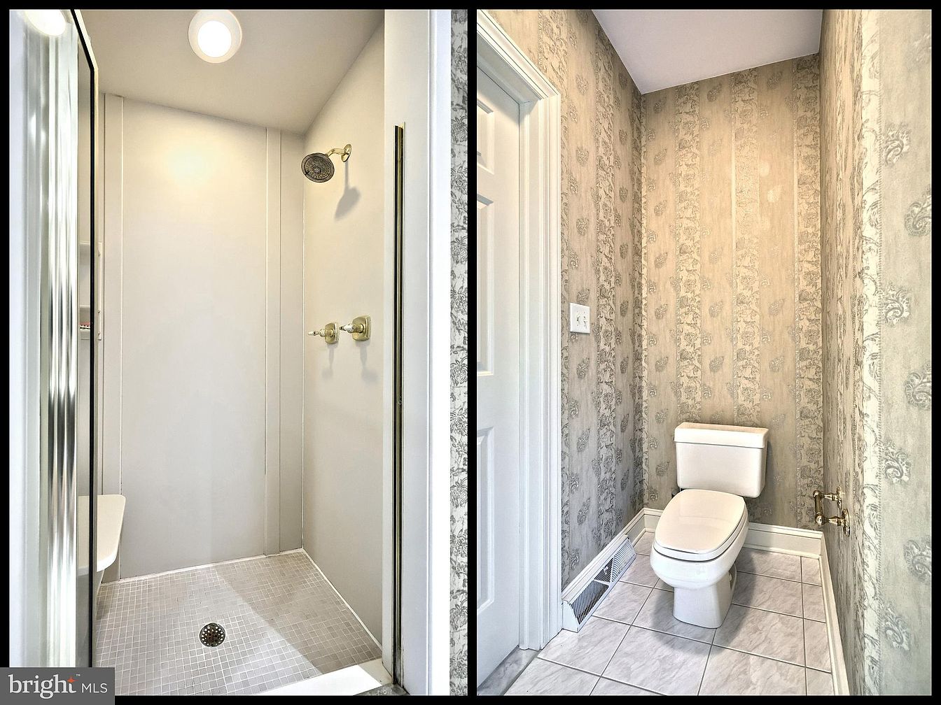 This bathroom section is divided into two main functional areas. On one side, the shower features a minimalist design with square light grey tiles on the floor and smooth, off-white walls. The shower has a vintage-style brass showerhead and matching control knobs, complementing the classic aesthetic. Opposite the shower is a compact toilet area with light beige floral-patterned wallpaper creating a subtle traditional ambiance. The floor is covered in white marble tiles with gray veins that add a touch of elegance. White baseboards and door frames emphasize the clean lines and contrast against the wallpapered walls, lending an overall classic yet understated charm to this bathroom space.