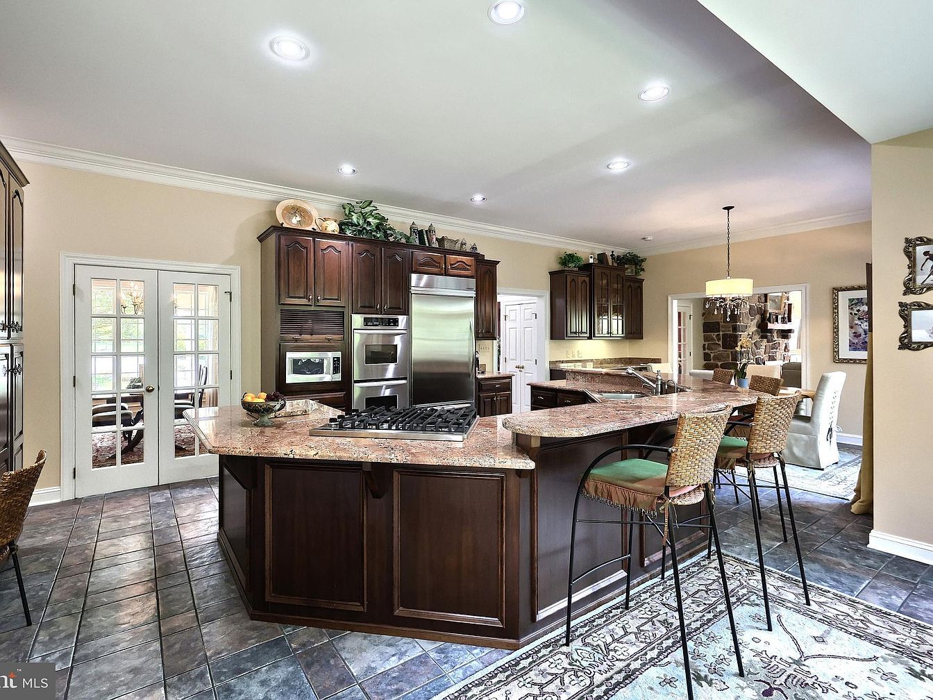 This spacious kitchen is designed around a large, multi-level island with rich, dark wood cabinetry and a polished granite countertop showcasing warm, earthy tones. The island hosts a built-in gas cooktop and offers ample seating with woven bar stools topped with green cushions, blending natural textures and comfort. The floor is tiled in slate shades, complementing the overall warm color palette of beige walls and cream ceiling with recessed lighting. Stainless steel appliances are neatly integrated into cabinetry, enhancing the classic yet functional aesthetic. Adjacent glass-paneled doors and an open dining area invite natural light and create a cohesive flow.