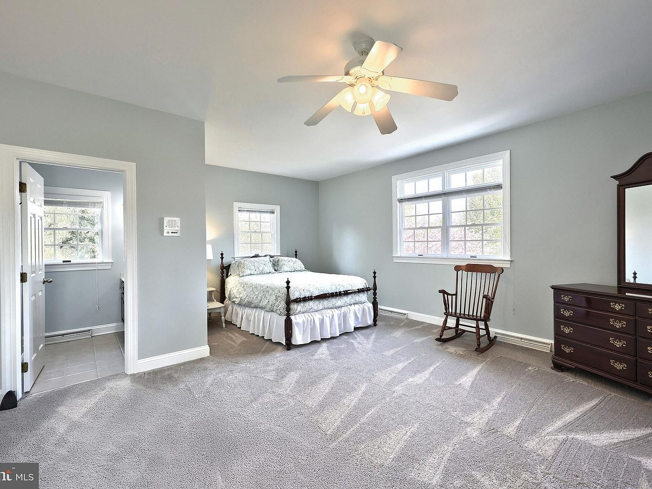 This spacious master bedroom features soft gray walls contrasted by white trim and molding, creating a calming and neutral color palette. The plush carpeting extends throughout the room, adding warmth and comfort underfoot. A classic dark wood four-poster bed is dressed in light floral bedding, pairing traditional charm with cozy appeal. Natural light floods the room through two large windows with white blinds, creating a bright and airy atmosphere. Furnishings include a vintage-style dark wood dresser with an attached mirror and a wooden rocking chair, adding old-fashioned elegance. A ceiling fan with light fixtures provides illumination and gentle air circulation. An open door reveals an adjoining room, presumably an en-suite bathroom or closet space, enhancing the bedroom’s functionality.