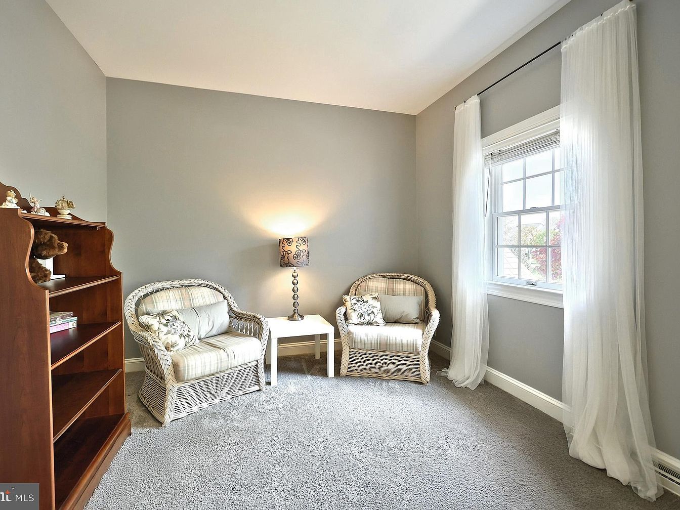 This intimate corner provides a quiet retreat with two cushioned wicker chairs arranged around a simple white side table holding a patterned table lamp that casts a warm glow. Soft gray walls complement the plush gray carpeting, creating a calm and neutral backdrop. A tall wooden bookshelf to the left adds warmth and character, with decorative items and books displayed. The large window, framed with flowing white sheer curtains, allows natural light to fill the space while maintaining an airy, inviting atmosphere. This nook balances comfort with understated elegance.