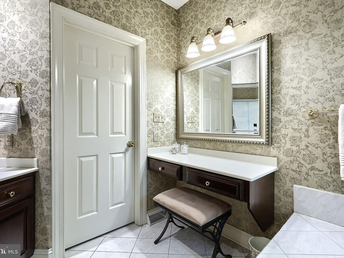 This bathroom corner features a classic vanity setup with a white countertop paired with dark wood cabinetry featuring elegant brass knobs. A large, ornate silver-framed mirror hangs on the wall, illuminated by a three-light fixture with frosted glass shades. The walls are adorned with vintage-style floral wallpaper in muted beige and taupe tones, adding a timeless charm. Below the vanity is a cushioned bench with wrought iron legs, providing a functional seating area. The flooring is laid with large, white tiles in a diagonal pattern, complementing the overall traditional and refined aesthetic.