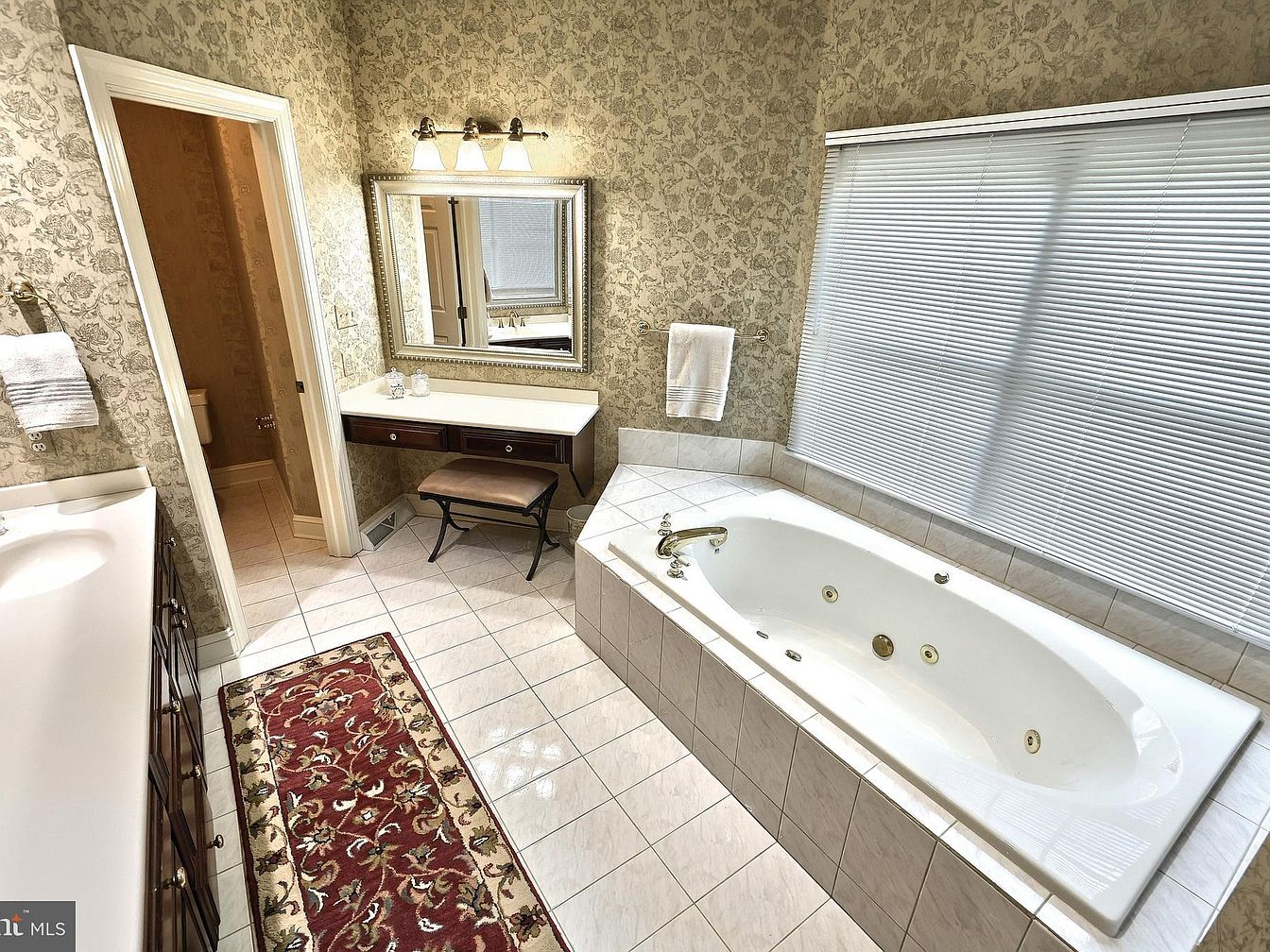 This master bathroom features a spacious layout centered around a large, white, tiled soaking tub with brass fixtures, set beneath a generously sized window dressed with white horizontal blinds for privacy and light control. Adjacent to the tub is a vanity area with a dark wood floating cabinet, topped with a clean white countertop and accompanied by a cushioned stool, creating a cozy dressing space. The walls are adorned with elegant, floral-patterned wallpaper in muted beige tones that complement the glossy cream tile flooring. A long, warm red and cream runner rug adds a classic touch and warmth to the space. Additionally, there’s a separate toilet area visible through an open door, offering privacy within the room’s thoughtful design.