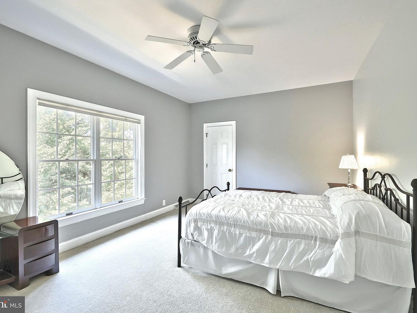 The master bedroom presents a serene and airy atmosphere with soft gray walls paired with bright white trim and ceiling, creating a crisp, clean contrast. A large window floods the room with natural light and offers a view of greenery outside. The focal point is a dark metal-framed bed dressed with a white comforter that enhances the bright and fresh feeling of the room. Light carpeting complements the overall neutral palette. Minimal wooden furniture, including a bedside table with a classic lamp and a small dark side table with a round mirror, add subtle warmth without overwhelming the simplicity. Ceiling fan adds a functional and modern touch to the space.