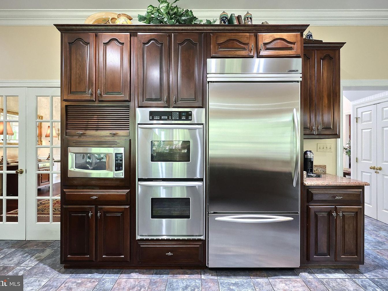 This section of the kitchen features a commanding wall of built-in appliances framed by rich, dark wood cabinetry with classic raised panel doors and ornate handles. A sleek stainless steel refrigerator, double oven, and microwave create a seamless, modern look against the warm, traditional cabinetry. The cabinetry extends to the ceiling, offering ample storage space with decorative crown molding on top. Granite countertops peek in from the right side, adding texture and elegance. The floor is tiled with a blue-gray pattern complementing the wood tones, while glass French doors on the left hint at an adjoining room filled with natural light and cozy accents.