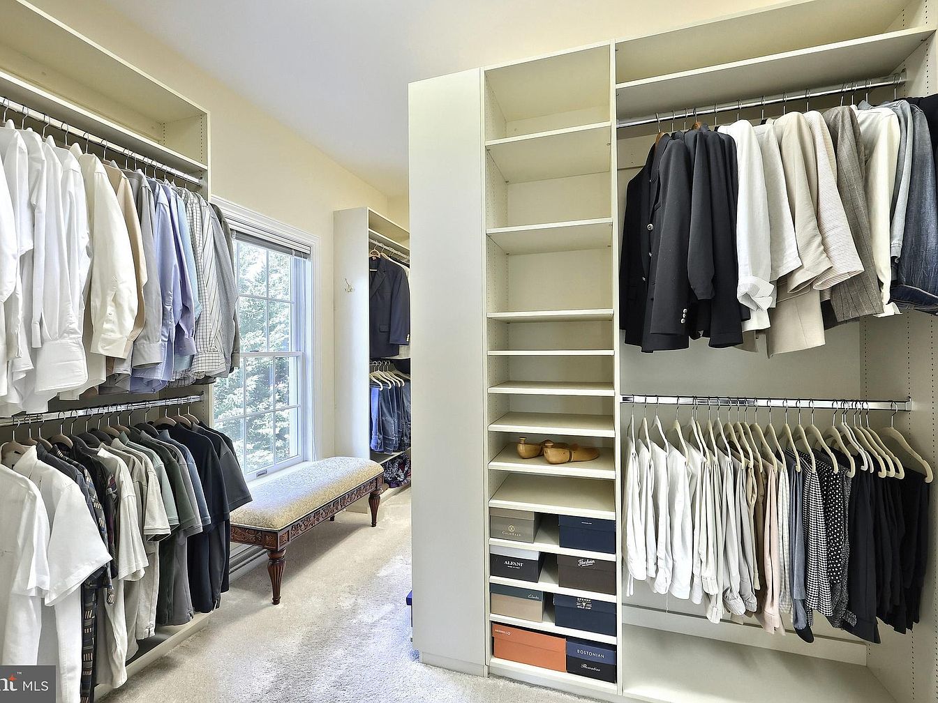 This walk-in closet is designed for both function and style, featuring built-in white shelving units that maximize vertical storage space. Double hanging rods on either side neatly organize a collection of shirts, jackets, and blouses arranged by color, creating a visually pleasing spectrum from light to dark. The centrally positioned shelving includes open cubbies for shoe boxes and personal items, adding to the overall tidiness. A large window bathes the closet in natural light, while a classic upholstered bench with carved wooden legs offers a spot for dressing or resting. The soft carpeting enhances a cozy, luxurious atmosphere.