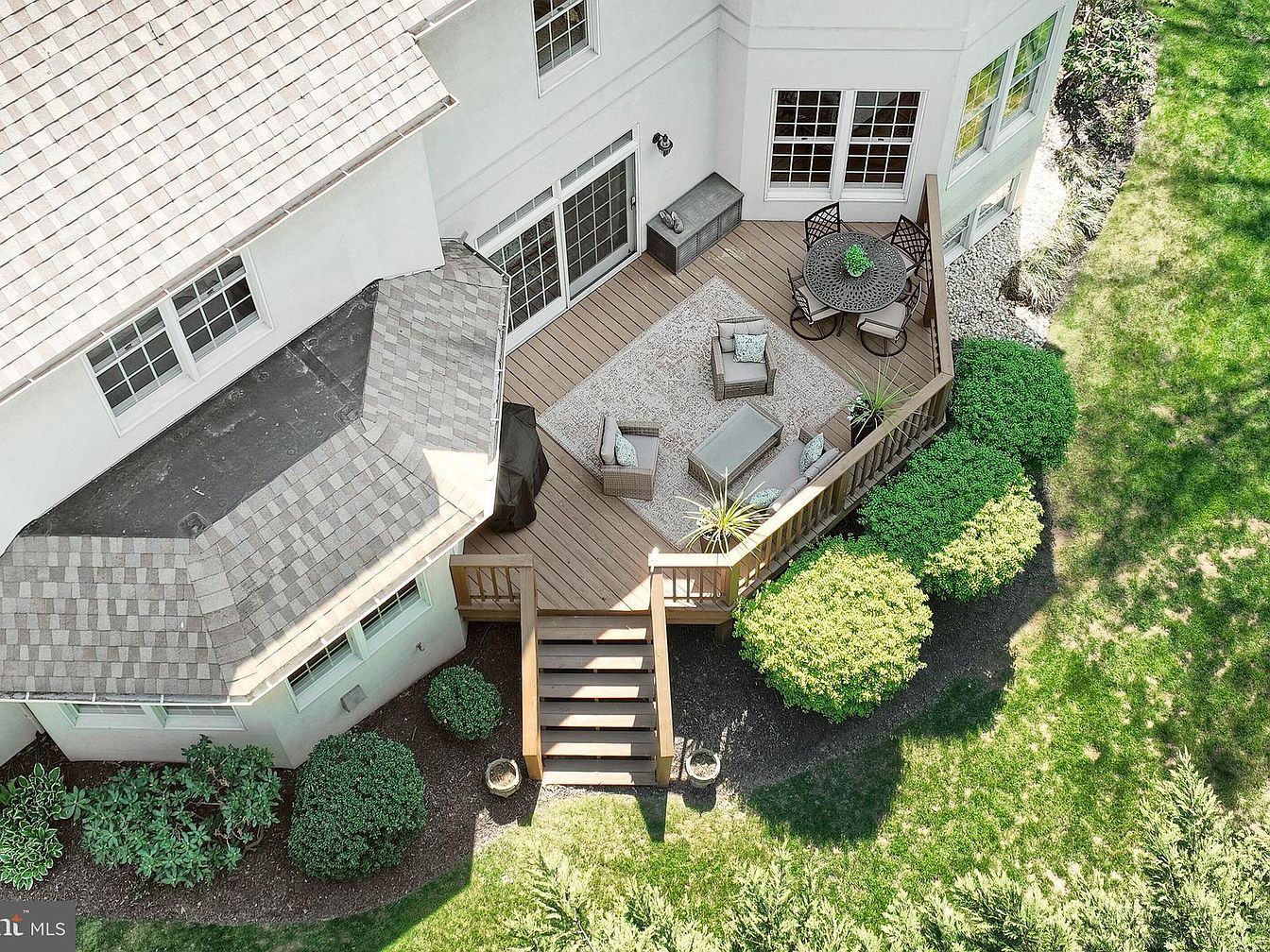 This backyard deck offers a serene outdoor living area with warm wood flooring and railings that complement the neutral beige exterior of the home. Accessible by a short staircase, the deck features a cozy seating arrangement centered around a soft beige outdoor rug, with cushioned wicker chairs and a matching coffee table, perfect for relaxation or casual conversation. Adjacent to this is a round metal dining table with cushioned chairs, adding functionality for alfresco meals. The surrounding landscaping includes neatly trimmed shrubs and vibrant green lawn, enhancing the tranquil, inviting atmosphere.
