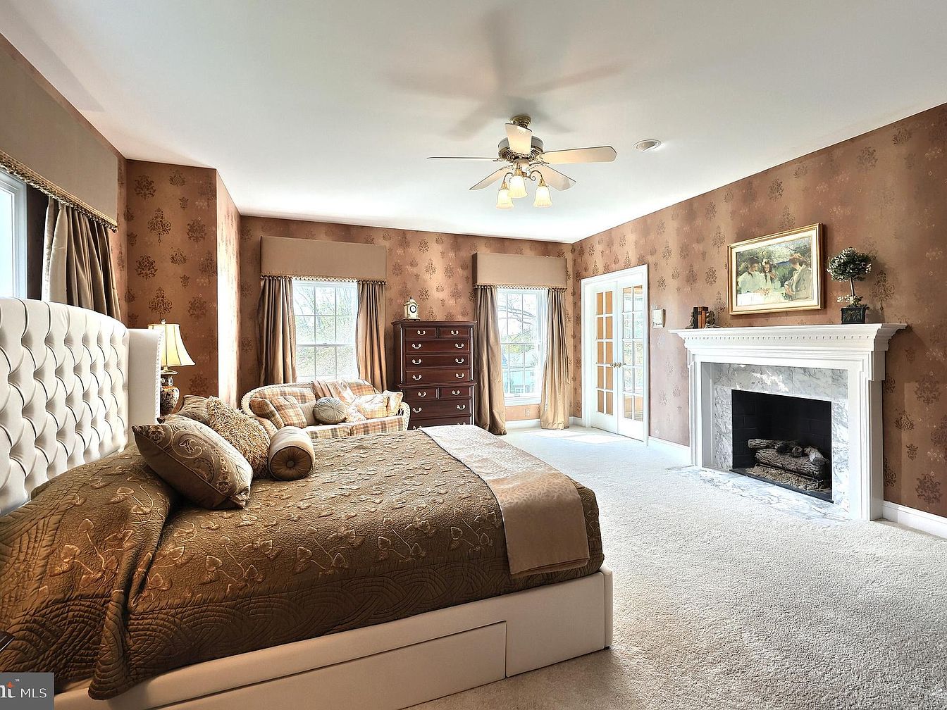 This spacious master bedroom features a warm, inviting design with rich brown damask-patterned wallpaper complementing the plush tan carpeting. The large bed has a tufted white upholstered headboard and is dressed in an intricately embroidered brown bedspread with matching decorative pillows. Twin windows, framed by gold-toned drapes and valances, allow natural light to fill the room. A classic wooden chest of drawers sits between the windows. Opposite the bed, a white marble fireplace with a traditional mantel brings an elegant focal point to the room, adorned with a framed painting and small decorative pieces. French doors add a refined architectural touch, enhancing the airy feel of the space.