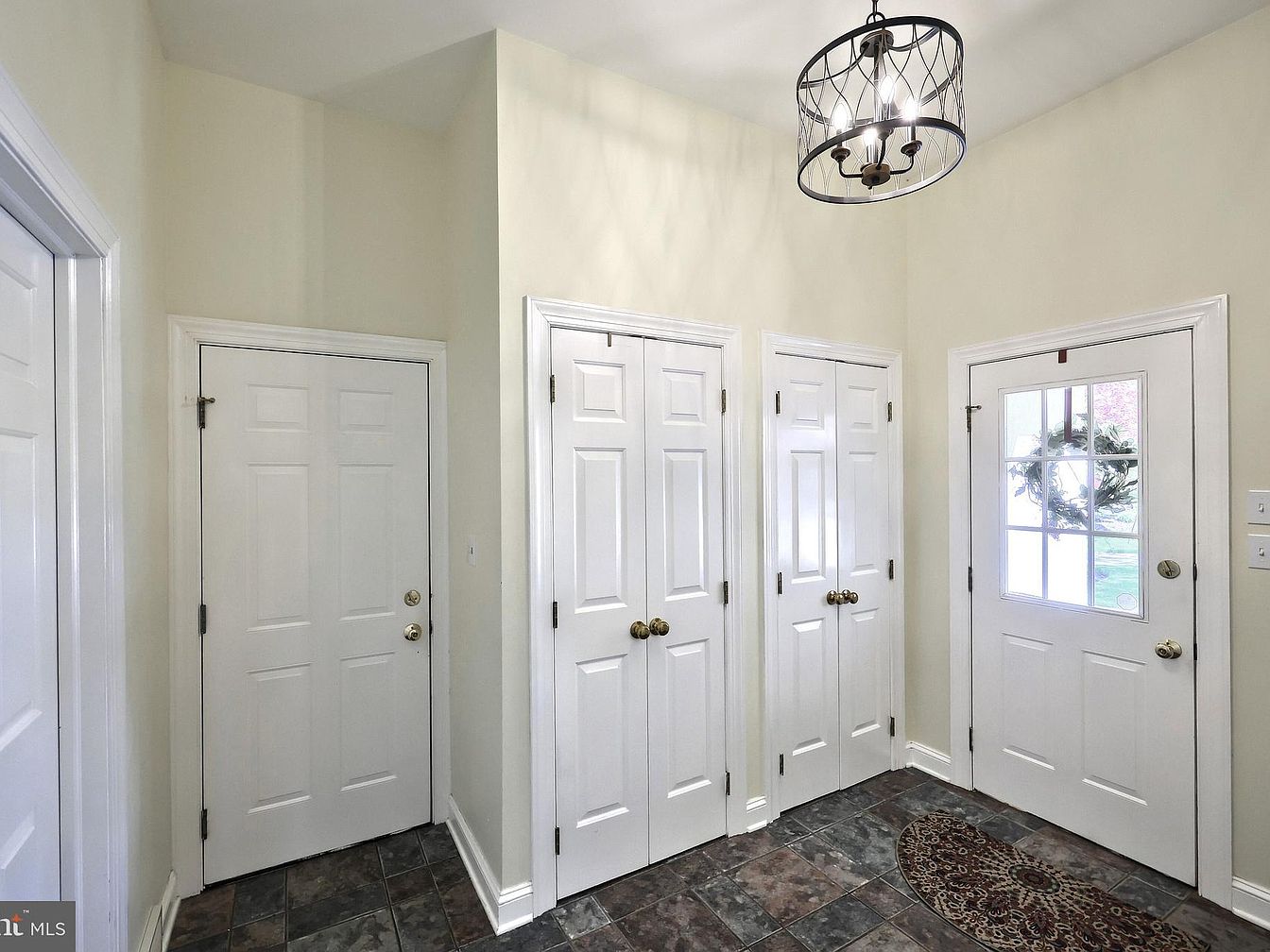 This home’s entryway features a practical layout with multiple white paneled doors, likely serving as closets and access points to adjacent rooms. The walls are painted in a soft cream tone, enhancing the space’s brightness. The floor is tiled with a mix of gray and brown slate tiles, contributing to durability and a touch of rustic charm. A round patterned rug adds warmth and contrast to the floor. Above, an elegant black metal chandelier with exposed bulbs casts artistic shadows on the walls, highlighting the high ceiling and inviting atmosphere of this transitional space.