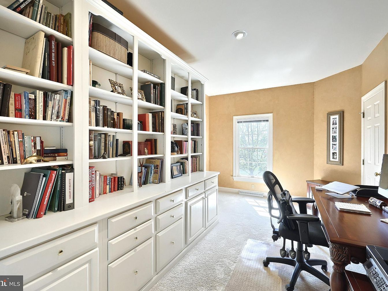 This home office features expansive built-in white bookshelves and cabinetry stretching along one wall, providing ample storage and display space for books and decorative items. The room’s walls are painted in a warm beige tone, creating a cozy yet professional atmosphere. A large window with white trim allows natural light to flood the space, brightening the beige carpeted floor. The office desk is a rich wood with intricate carved legs, paired with a black ergonomic mesh chair on wheels for comfort and mobility. The overall design balances functionality with classic elegance.