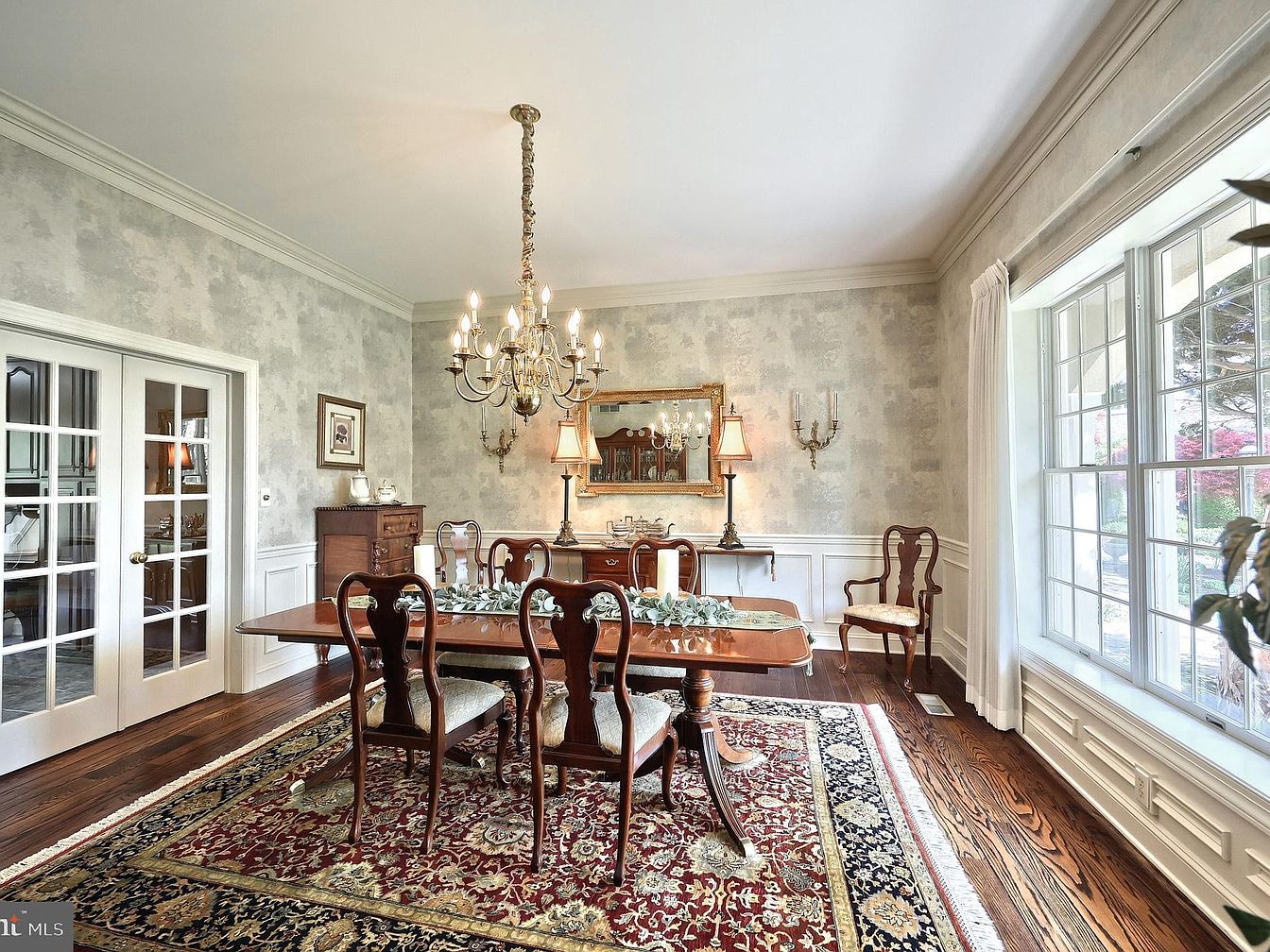 This formal dining room features an elegant traditional design with rich wooden flooring and a sophisticated area rug that anchors the dining table. The polished wood table is paired with six matching chairs showcasing classic carved backs and cushioned seats. A large window lets in abundant natural light, complemented by white curtains and intricate molding around the frame. The walls combine a textured, soft gray upper finish with white wainscoting below. An ornate chandelier hangs above the table, flanked by matching wall sconces and lamps on a wooden sideboard beneath a decorative framed mirror, enhancing the room’s stately atmosphere.