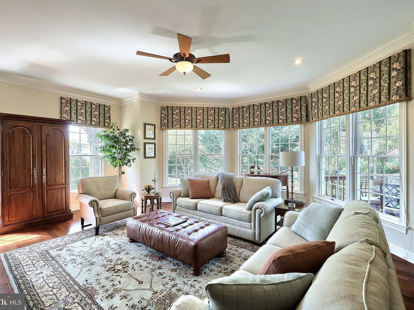 This inviting living room features a soft, neutral color palette with light beige walls and cream-colored upholstered sofas accented by plush pillows in muted earthy tones. A large, patterned area rug anchors the seating area, complementing the rich wooden floors. Abundant natural light floods the room from the series of classic, white-trimmed windows, dressed with traditional floral valances in shades of green and rose. Furniture includes elegant rolled-arm sofas, a matching armchair, and a tufted leather ottoman serving as a coffee table. Warm wood furniture pieces and a ceiling fan add both texture and comfort to the space.