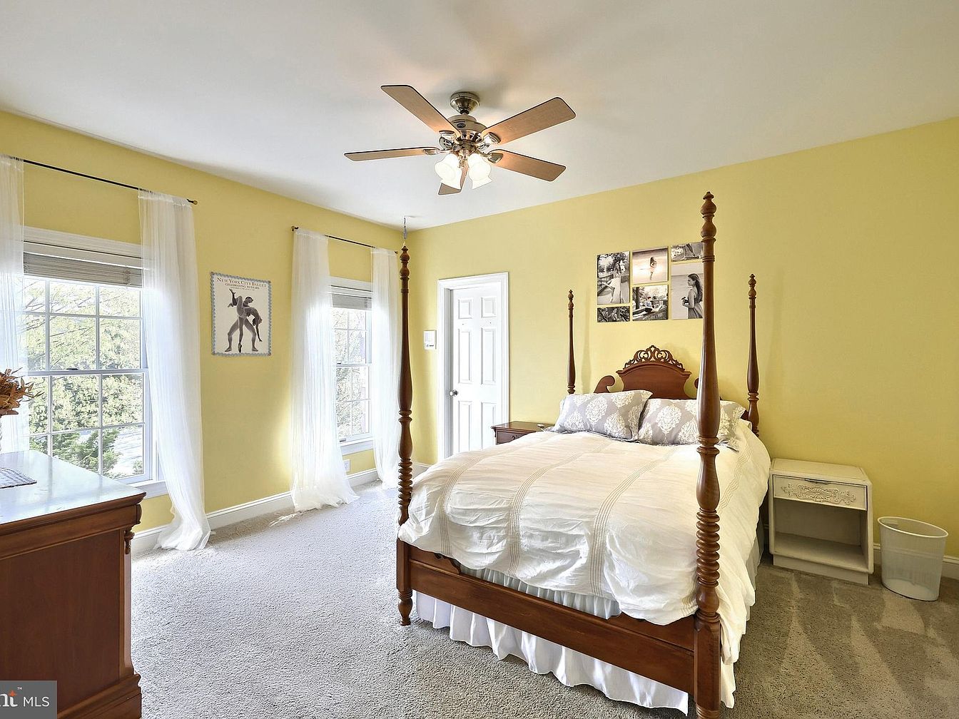 This master bedroom features a warm and inviting ambiance with soft yellow walls paired with light gray carpeting that adds comfort underfoot. The centerpiece is a classic wooden four-poster bed with intricate detailing on the headboard, dressed in crisp white bedding with patterned accent pillows. Two large windows with sheer white curtains let in natural light, enhancing the room’s airy feel. A wooden dresser complements the bed’s finish, while a white nightstand and a small trash bin add functional elements. A ceiling fan with light fixtures provides both airflow and illumination, balancing traditional charm with modern comfort.