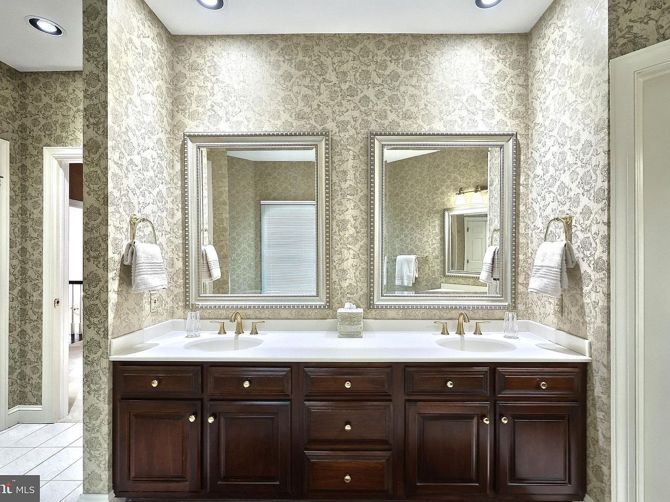 This bathroom features a double vanity with a rich, dark wood cabinet base providing ample storage through multiple drawers and cupboards. Two large, rectangular mirrors with decorative silver frames hang above separate under-mounted sinks that sit on a smooth, white countertop. The polished brass faucets and matching towel rings add a touch of classic elegance. The walls are adorned with a light beige floral patterned wallpaper, adding warmth and texture to the space. Ceiling recessed lighting brightens the area, highlighting the refined, traditional style of the vanity setup.