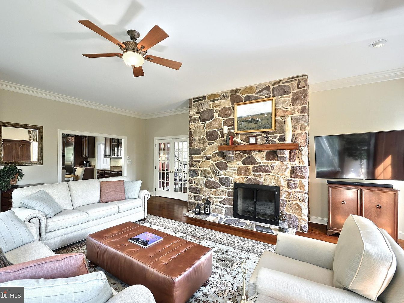 This living room centers around a full stone fireplace that adds a warm, rustic charm to the space, complemented by a wooden mantel displaying art and decor. The room features soft, neutral tones with beige walls and white crown molding that brighten the area. Comfortable seating includes a light-colored sofa and matching armchairs arranged around a large, tufted brown leather ottoman, which serves as a coffee table. A large patterned area rug anchors the furniture on polished hardwood floors. An elegant ceiling fan with wooden blades adds both functionality and style. A flat-screen TV rests on a wooden cabinet, completing this inviting, balanced living space.