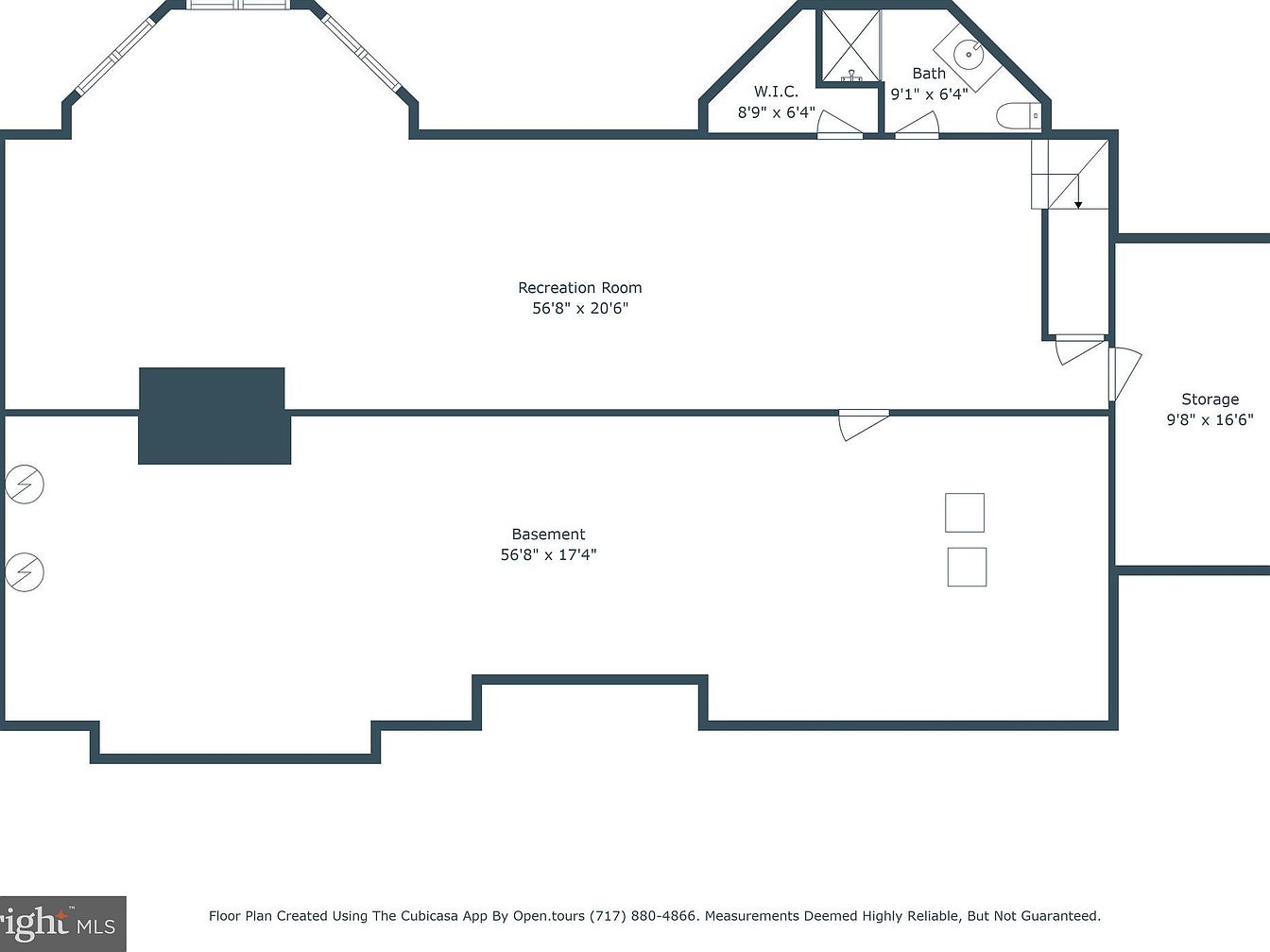 This basement level features a spacious recreation room measuring 56’8″ by 20’6″ which is perfect for entertainment or leisure activities. Adjacent to it is a large open basement area slightly narrower, measuring 56’8″ by 17’4″, offering versatile space for storage, a workshop, or additional living purposes. At the top right, a walk-in closet and a bathroom with essential fixtures provide convenient amenities. A storage room, sized 9’8″ by 16’6″, is accessible from the basement. The layout emphasizes functionality and ample open space, ideal for family gatherings or versatile usage.