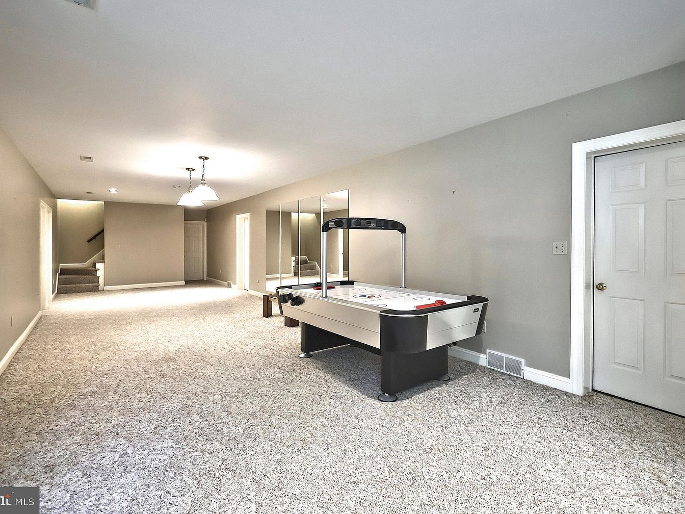 This spacious basement features a neutral color palette with soft beige walls and a textured light gray carpet, creating a cozy yet open atmosphere. The area is well-lit by ceiling-mounted light fixtures featuring frosted glass shades. An air hockey table acts as the focal point, providing a fun recreational element. Along one wall, large mirrors visually expand the space and add depth. The room includes white trim and baseboards that nicely contrast the wall color. Two doorways and a stairwell lead to adjoining rooms and upper levels, enhancing accessibility and flow within the home.