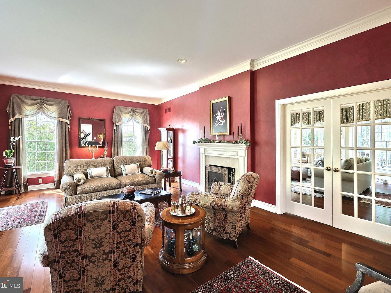 This elegant living room features rich, deep red walls that create a warm and inviting atmosphere. Hardwood flooring enhances the room’s classic appeal while complementing the traditional patterned upholstery on the sofa and armchairs. Two large windows dressed with valances and drapes allow natural light to brighten the space. The white fireplace mantel acts as a focal point, adorned with simple greenery and candles beneath a framed artwork. French double doors with glass panels lead to an adjacent room, maintaining an open, airy feel. The layout encourages easy conversation and relaxation.