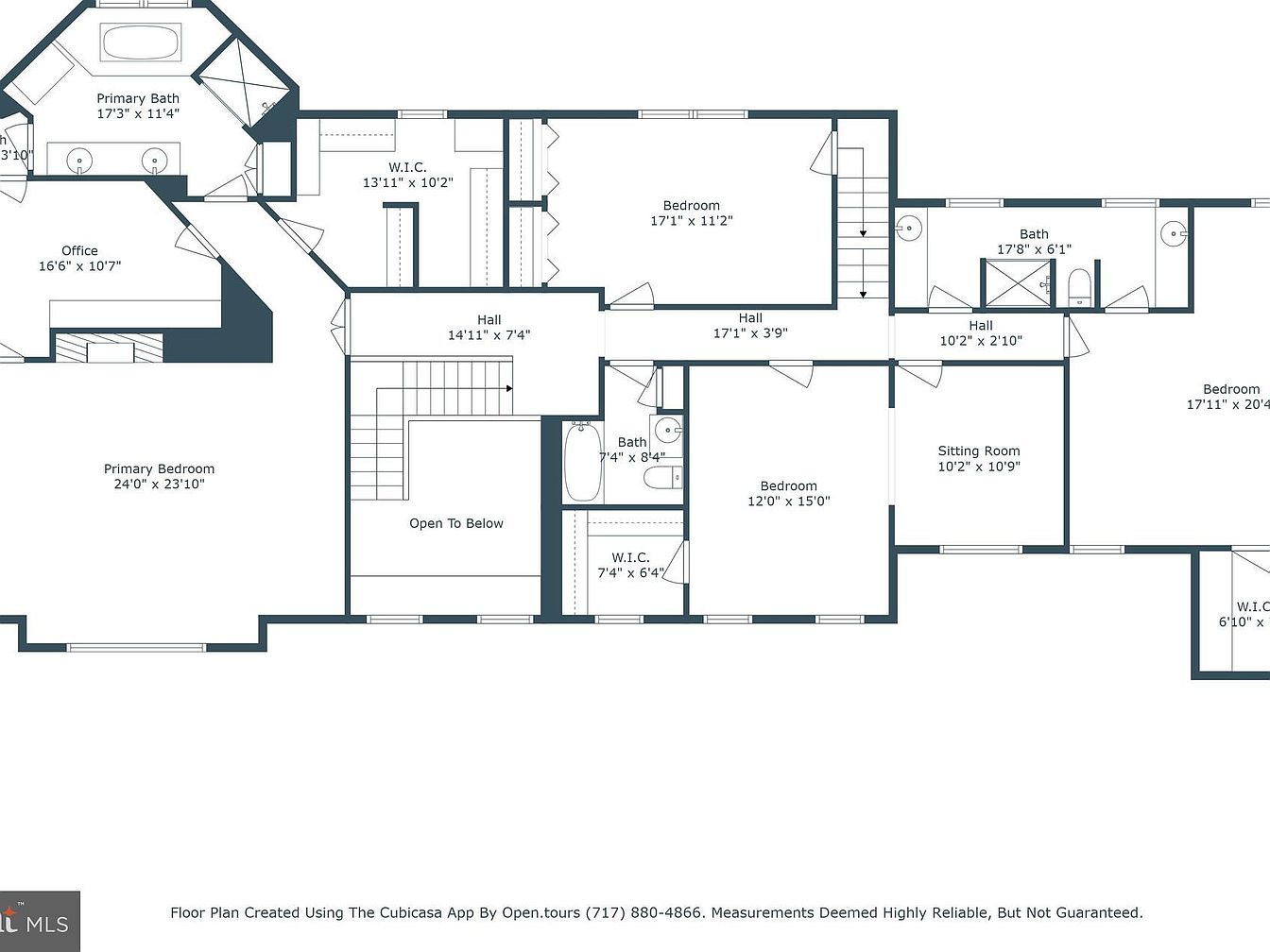 This floor plan highlights the upper level of a spacious home featuring a large primary bedroom with generous dimensions of 24’0″ by 23’10”. Adjacent is a dedicated office space, ideal for remote work or study. The primary bath is well-appointed, including dual sinks and a large bathtub area. Two secondary bedrooms offer comfortable living spaces, each with their own walk-in closets, and are conveniently located near full bathrooms. A small sitting room provides a cozy retreat, and multiple hallways connect rooms while the central staircase opens to the floor below, enhancing openness and flow.
