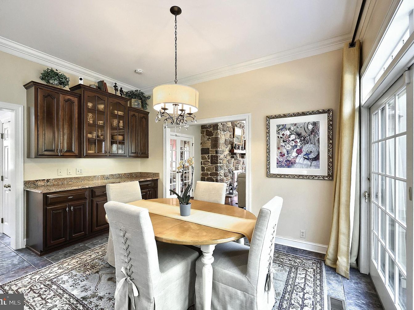 This cozy breakfast nook features a round wooden table surrounded by four white linen-upholstered chairs with decorative tie backs. The area is anchored by a richly patterned area rug in neutral tones that complement the soft beige walls. Above the table hangs an elegant drum chandelier with crystal accents that adds a warm glow. Against the wall, dark wood cabinetry with glass-front upper cabinets displays dishware, topped with greenery for a natural touch. A large window with light yellow curtains allows ample daylight, while artwork on the wall adds subtle color and interest, connecting to the adjoining room’s stone fireplace seen through the doorway.
