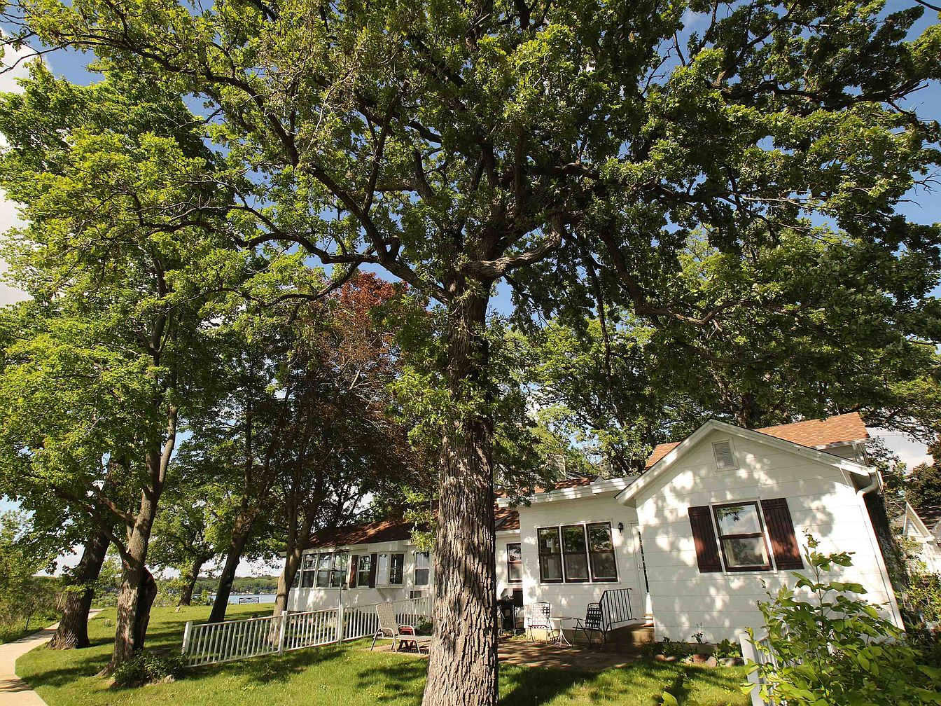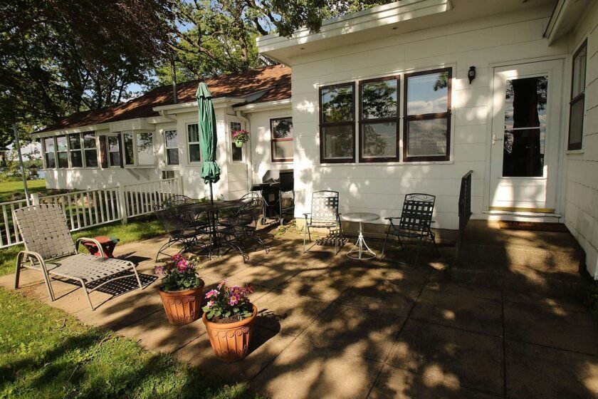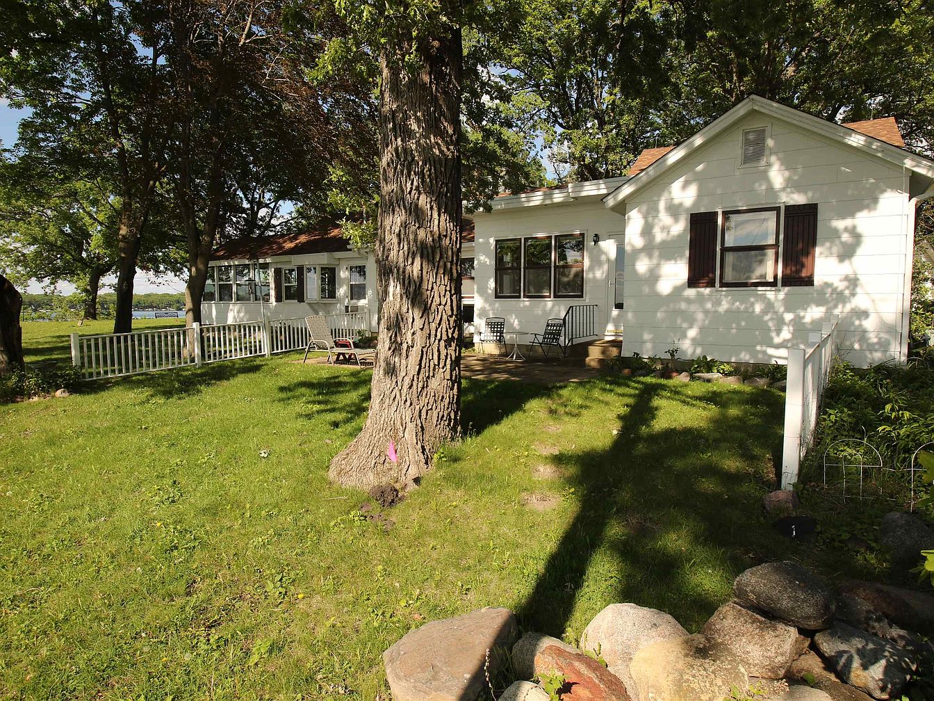 The image showcases the exterior of a historic home, featuring a quaint sunroom and traditional siding. The house has a clean, white exterior with dark red shutters, set against a lush green lawn. A large tree stands prominently in the foreground, providing shade. The patio area includes simple outdoor seating arrangements, inviting relaxation. The setting is enhanced by the nearby lake, visible in the background, contributing a serene ambiance. Flagstone creates a decorative pathway leading to the entrance, while a white picket fence outlines the area, adding to the classic American aesthetic.